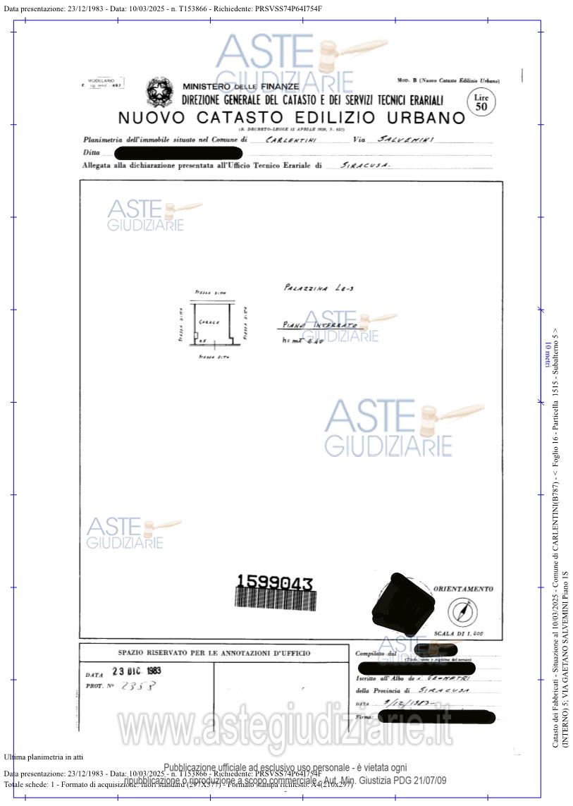 Vendita all'asta Senza incanto, con gara telematica sincrona mista - LOTTO 2: Piena ed intera proprietà di garage in Carlentini (SR), Via Gaetano Salvemini n. 9, piano sottostrada, int. 5, Palazzina L2/3, in N.C.E.U. al foglio 16, p.lla 1515 sub 5, cat. C/6, cl. 3, consistenza mq 17, superficie catastale totale mq 17, R.C. € 42,14, Via Gaetano Salvemini piano 1s interno 5. Prezzo base € 5.272,50 (offerta minima € 3.954,37). Data vendita 15/05/2026 ore 11:00. Giudice Giuseppe Solarino. Professionista delegato alla vendita Avv. Paolo Munafò - Email "avv.paolomunafo@mbcg.it"; Cell. 3387429274; Tel. 09311562510. Custode Giudiziario Avv. Paolo Munafò - Email "avv.paolomunafo@mbcg.it"; Cell. 3387429274; Tel. 09311562510. Rif. Tribunale di Siracusa - Espropriazione immobiliare (cartabia) n. 26/2024