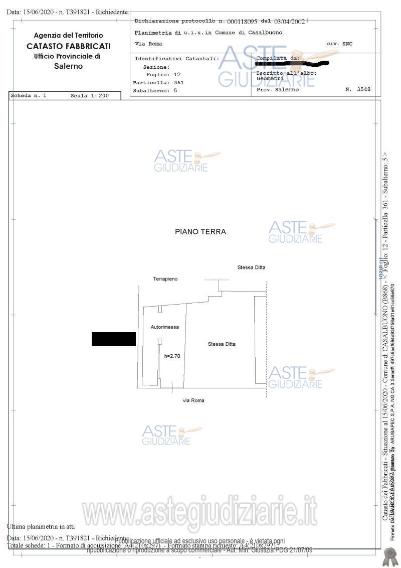 Vendita all'asta Senza incanto, con gara telematica asincrona - LOTTO 3: Garage sito in via Roma snc, riportato in Catasto Fabbricati dell’Ufficio Provinciale di Salerno al Foglio 12, particella 361, sub 5, cat C/6, consistenza 37mq, cl. 10, superficie catastale totale 43 mq, piano terra. Prezzo base € 4.100,00 (offerta minima € 3.075,00). Data inizio operazioni di vendita: 13/01/2026 ore 15:30. Professionista delegato alla vendita Dott. Ivo De Maio - Email "ivodemaio@katamail.com"; Cell. 3495520914. Custode Giudiziario Dott. Ivo De Maio - Email "ivodemaio@katamail.com"; Cell. 3495520914. Rif. Tribunale di Lagonegro - Esecuzione immobiliare post legge 80 n. 58/2017