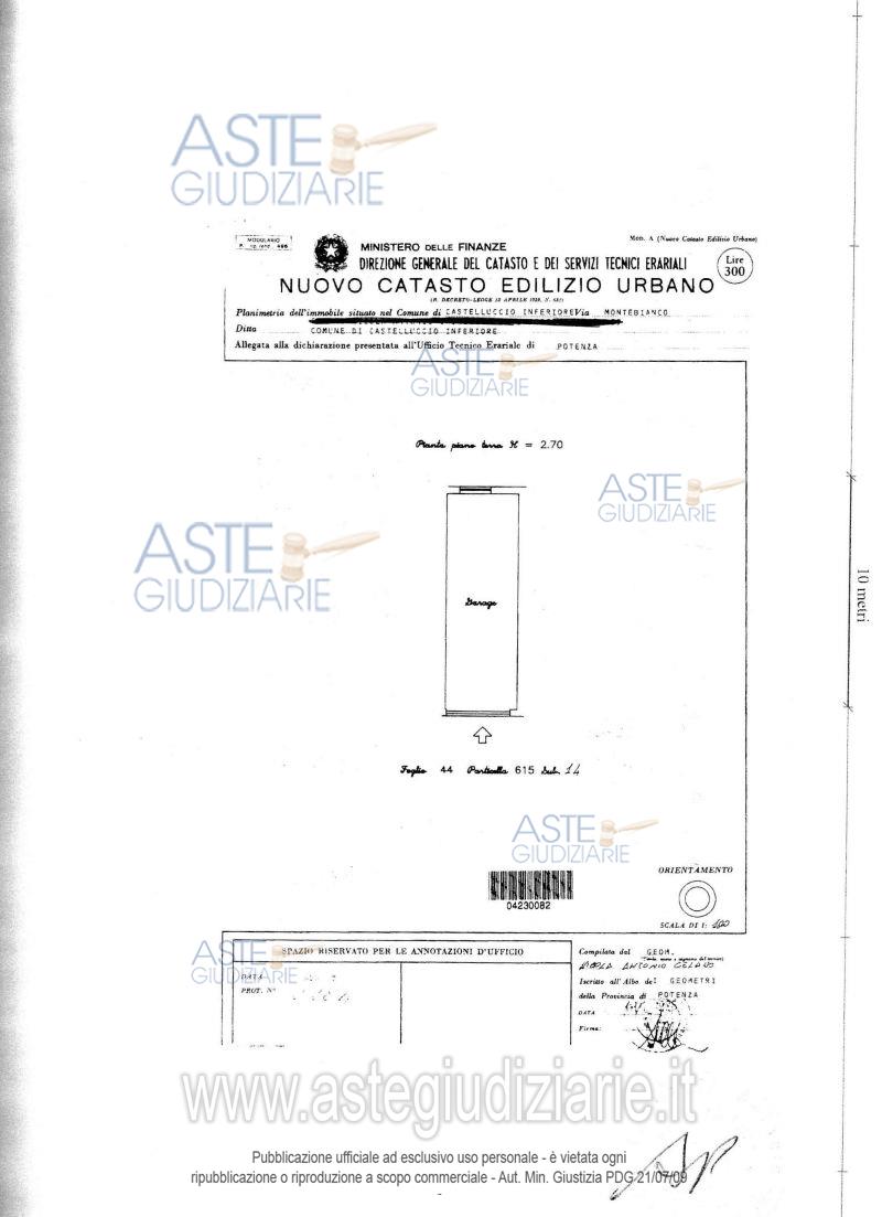 Vendita all'asta Senza incanto, con gara telematica asincrona - LOTTO 1: In catasto: F. 44 Particella 615 sub.14 N.C.E.U. Categoria: C/6; Ubicazione: Comune di Castelluccio Inferiore (Pz) viale Monte Bianco 2 Piano terra Proprietà: diritti di proprietà superficiaria pari a 1/1 . Prezzo base € 6.555,16 (offerta minima € 4.916,37). Data inizio operazioni di vendita: 12/05/2026 ore 17:00. Professionista delegato alla vendita Avv. Katia Di Palma - Email "avvkdipalma@tiscali.it"; Cell. 3488290171. Custode Giudiziario Geom. Istituto Vendite Giudiziarie Di Lagonegro - Email "ivg.lagonegro@libero.it"; Tel. 0973642239. Rif. Tribunale di Lagonegro - Esecuzione immobiliare post legge 80 n. 18/2009
