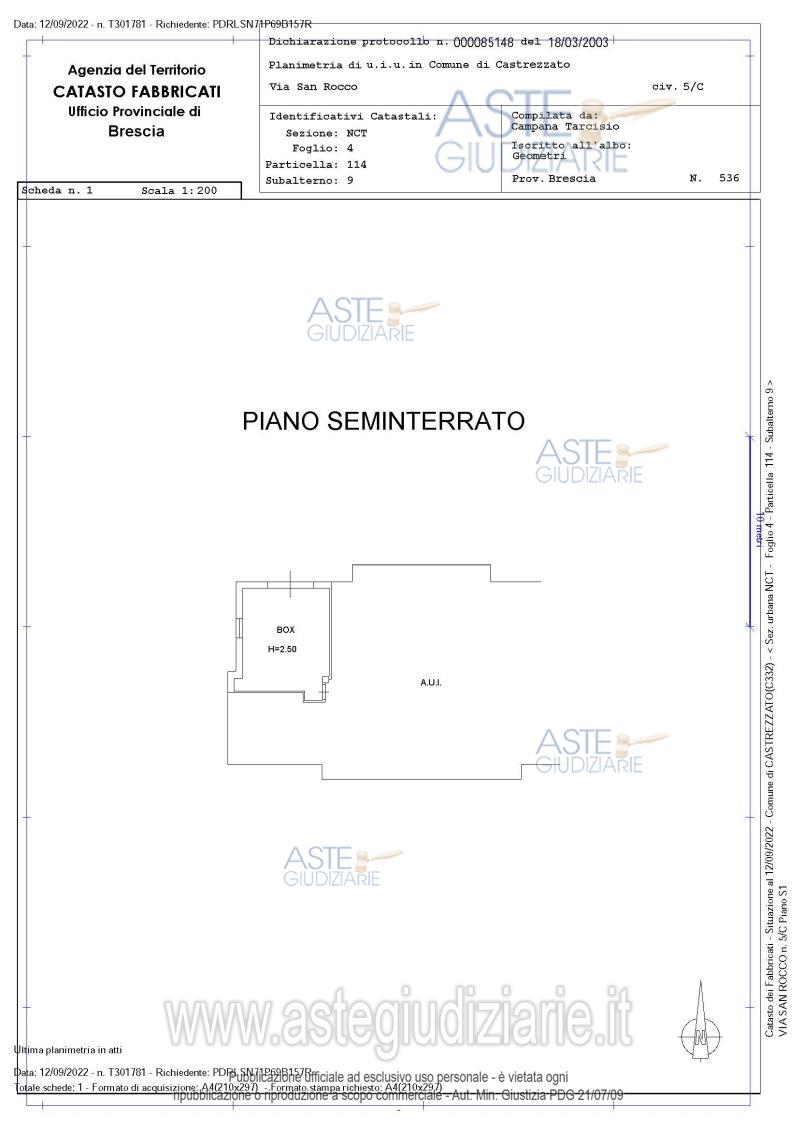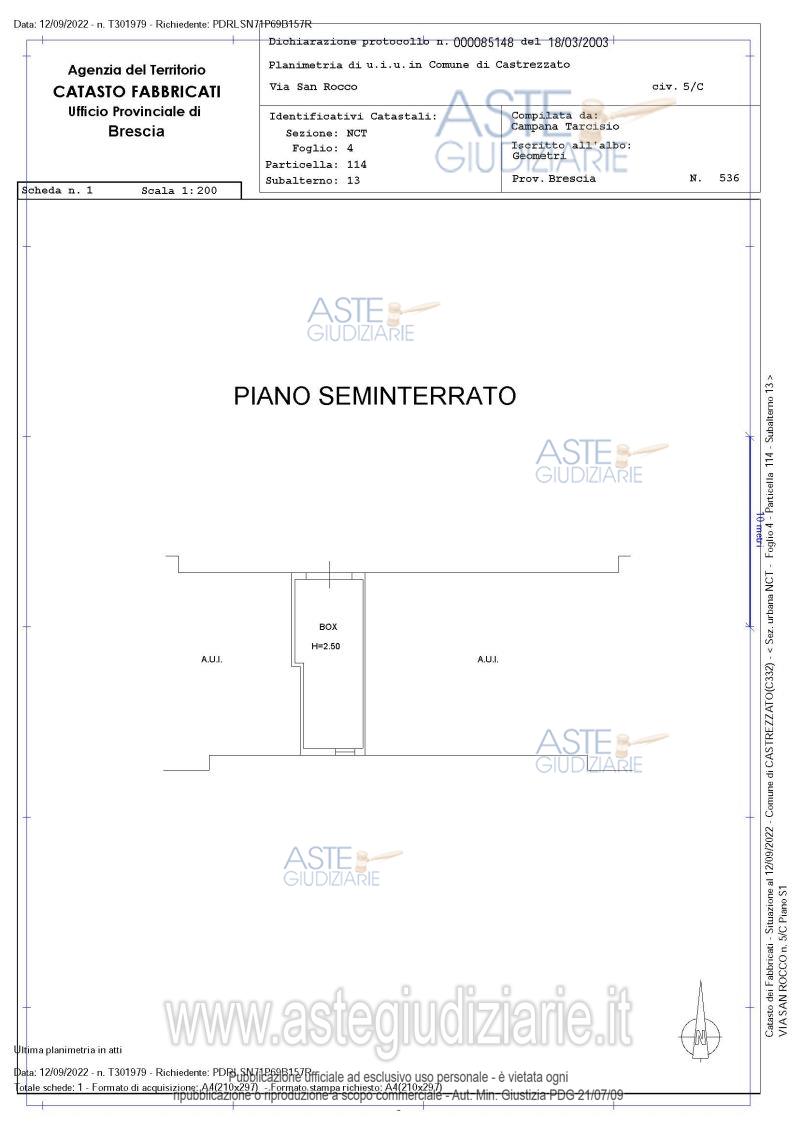 Vendita all'asta Senza incanto, con gara telematica asincrona - LOTTO 9: Piena proprietà. Trattasi di autorimessa posta a piano seminterrato, il tutto censito alCatasto Fabbricati - Sez. NCT - Fg. 4 mapp. 114 sub 13 P. S1, cat. C6 - mq. 30 con le proporzionali quote delle parti comuni ai sensi di legge. Prezzo base € 9.478,89 (offerta minima € 7.109,17). Data inizio operazioni di vendita: 28/01/2026 ore 10:30. Giudice Dellesecuzione Giudice. Professionista delegato alla vendita Dott. Giuseppe Crapanzano - Email "crapanzano@doncra.it". Custode Giudiziario Dott. Giuseppe Crapanzano - Email "crapanzano@doncra.it". Rif. Tribunale di Brescia - Esecuzione immobiliare post legge 80 n. 164/2022