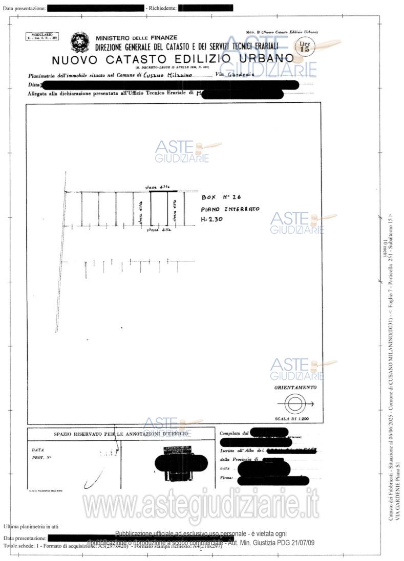 Vendita all'asta Senza incanto, con gara telematica sincrona - LOTTO UNICO: Box singolo, della superficie commerciale di 13,00 mq per la quota di 1/1 di piena proprietà. Trattasi di un box posto al piano interrato. IL TRIBUNALE DI MONZA NON HA CONFERITO ALCUN INCARICO A INTERMEDIARI O AGENZIE IMMOBILIARI PER LA PUBBLICITÀ GIUDIZIARIA E L’ASSISTENZA ALLA PARTECIPAZIONE ALL’ASTA DEI BENI IMMOBILI. Prezzo base € 12.200,00 (offerta minima € 9.150,00). Data vendita 15/06/2026 ore 10:00. Professionista delegato alla vendita Dott. Salvatore Leggiero - Email "salvatoreleggiero@studioleggiero.com"; Tel. 0398882028. Custode Giudiziario Dott. Salvatore Leggiero - Email "salvatoreleggiero@studioleggiero.com"; Tel. 0398882028. Rif. Tribunale di Monza - Espropriazione immobiliare (cartabia) n. 161/2025