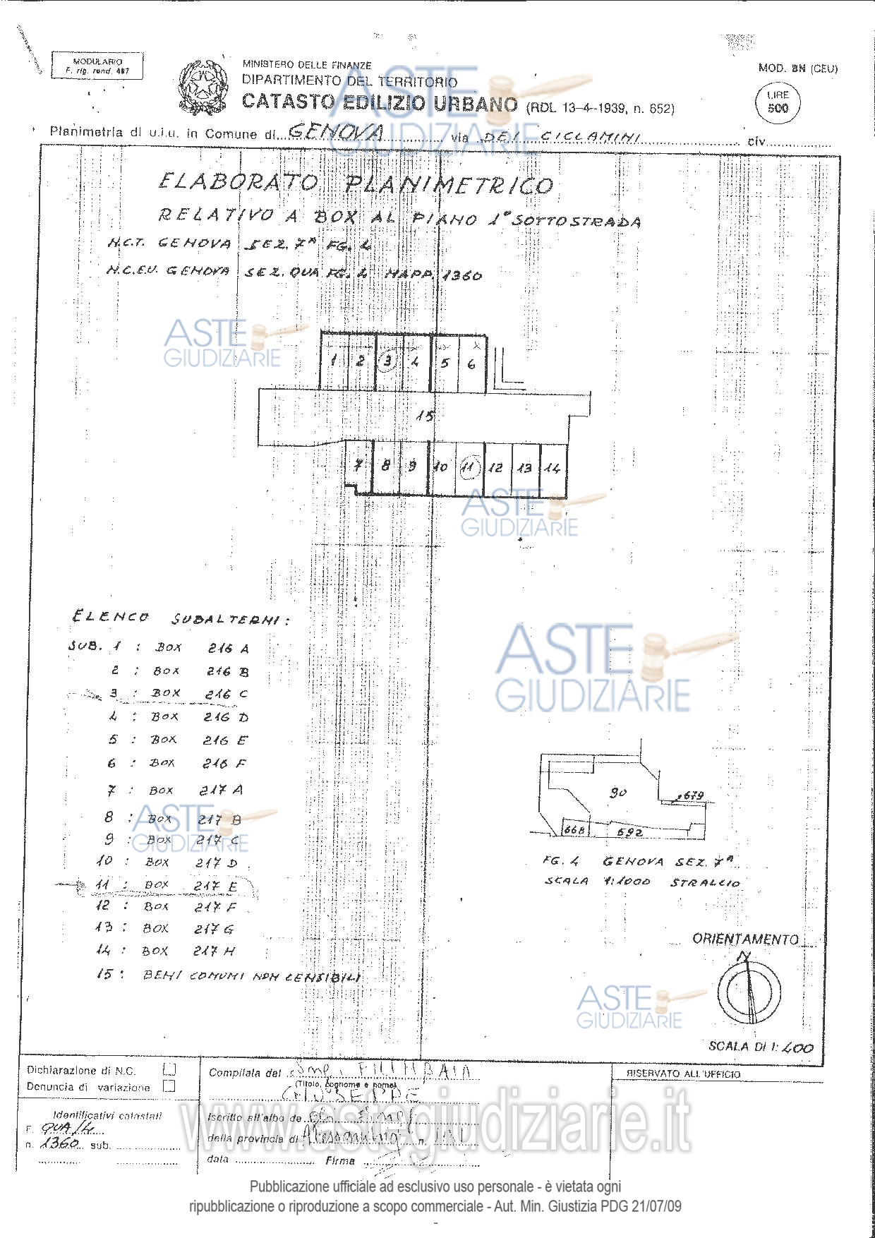 Vendita all'asta Senza incanto, con gara telematica sincrona - LOTTO 15: For the full and entire ownership: Single garage located in GENOA at Via dei Ciclamini s.n.c, in the Quarto Alto neighborhood, with a commercial area of 14.47 square meters. Prezzo base € 10.317,00 (offerta minima € 10.317,00). Data vendita 26/03/2026 ore 12:00. Giudice Dott. Roberto Braccialini. Curatore Dott. Stefania Chiaruttini. Rif. Tribunale di Genova - Fallimentare (nuovo rito) n. 98/2015