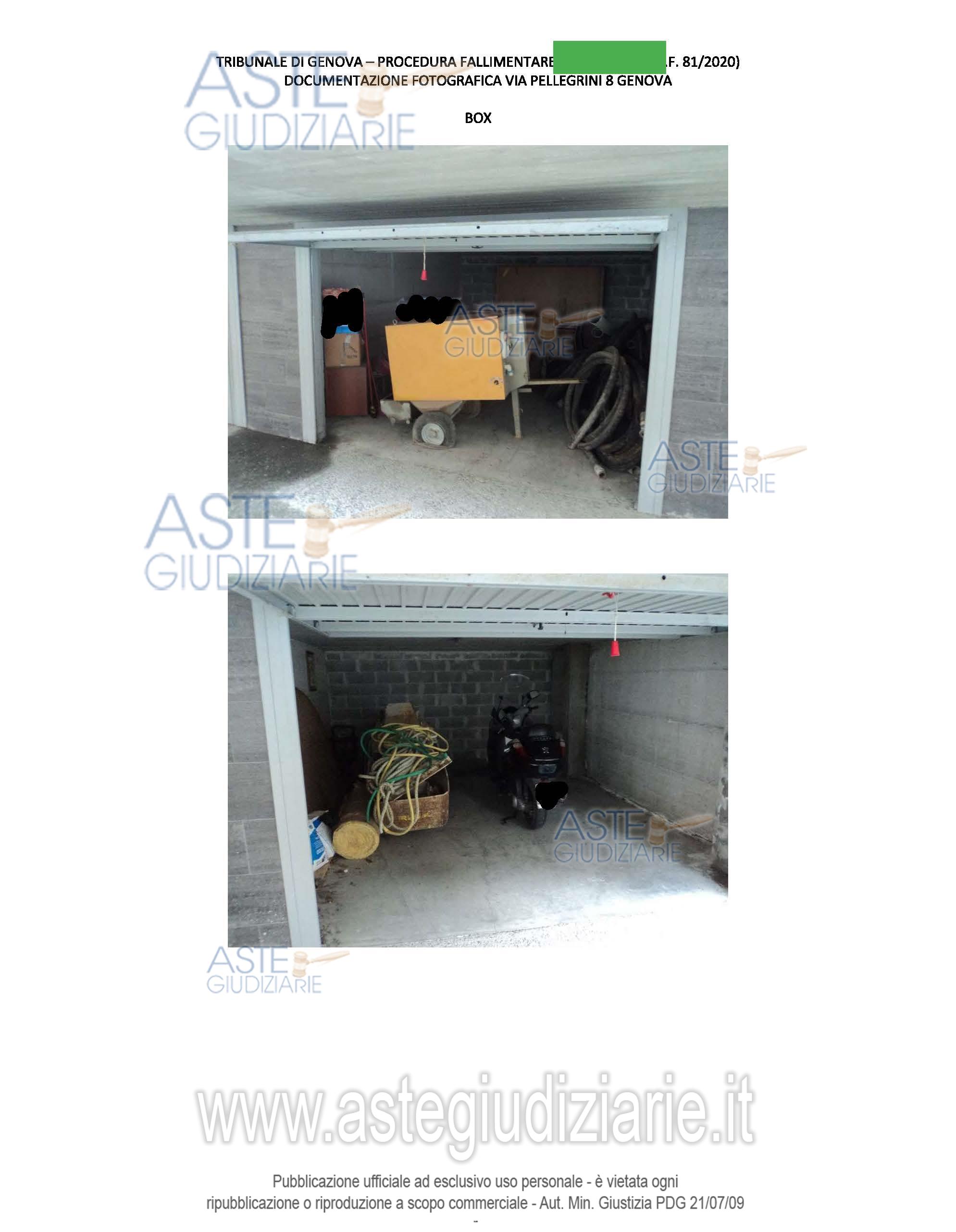 Vendita all'asta Senza incanto, con gara telematica sincrona mista - LOTTO UNICO: Piena proprietà N. 02 BOX in Genova Sampierdarena, Via Antonio Pellegrini civ 8 p T: -C/6 mq 18 rc 158,97 ; -C/6 mq 17 RC 150,13 ; . Prezzo base € 22.000,00 (offerta minima € 16.500,00). Data vendita 07/07/2026 ore 12:00. Curatore Dott. Domenica Laurenzana - Email "domenica.laurenzana@odcec.ge.it"; Tel. 010/2510545; Cell. 335/5392731.