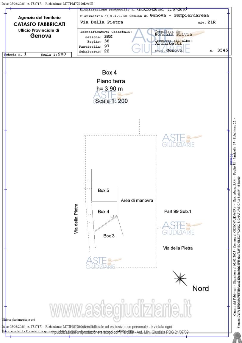 Vendita all'asta Senza incanto, con gara telematica sincrona mista - LOTTO 2: Box di recente costruzione avente accesso coperto da area comune che affaccia su area privata chiusa da cancello d'ingresso ed è posto al piano terreno di un edificio elevantesi in più piani fuoriterra.Il box è dotato di serranda dotata di motore di apertura, oggi non funzionante, fornitura di acqua con lavandino. Prezzo base € 19.500,00 (offerta minima € 14.625,00). Data vendita 18/03/2026 ore 14:30. Professionista delegato alla vendita Avv. Lucia Canepa - Email "luciacanepa@libero.it"; Cell. 3356442421. Custode Giudiziario Dott. Sovemo - Email "genova@sovemo.com"; Tel. 0105299253. Rif. Tribunale di Genova - Espropriazione immobiliare (cartabia) n. 13/2025