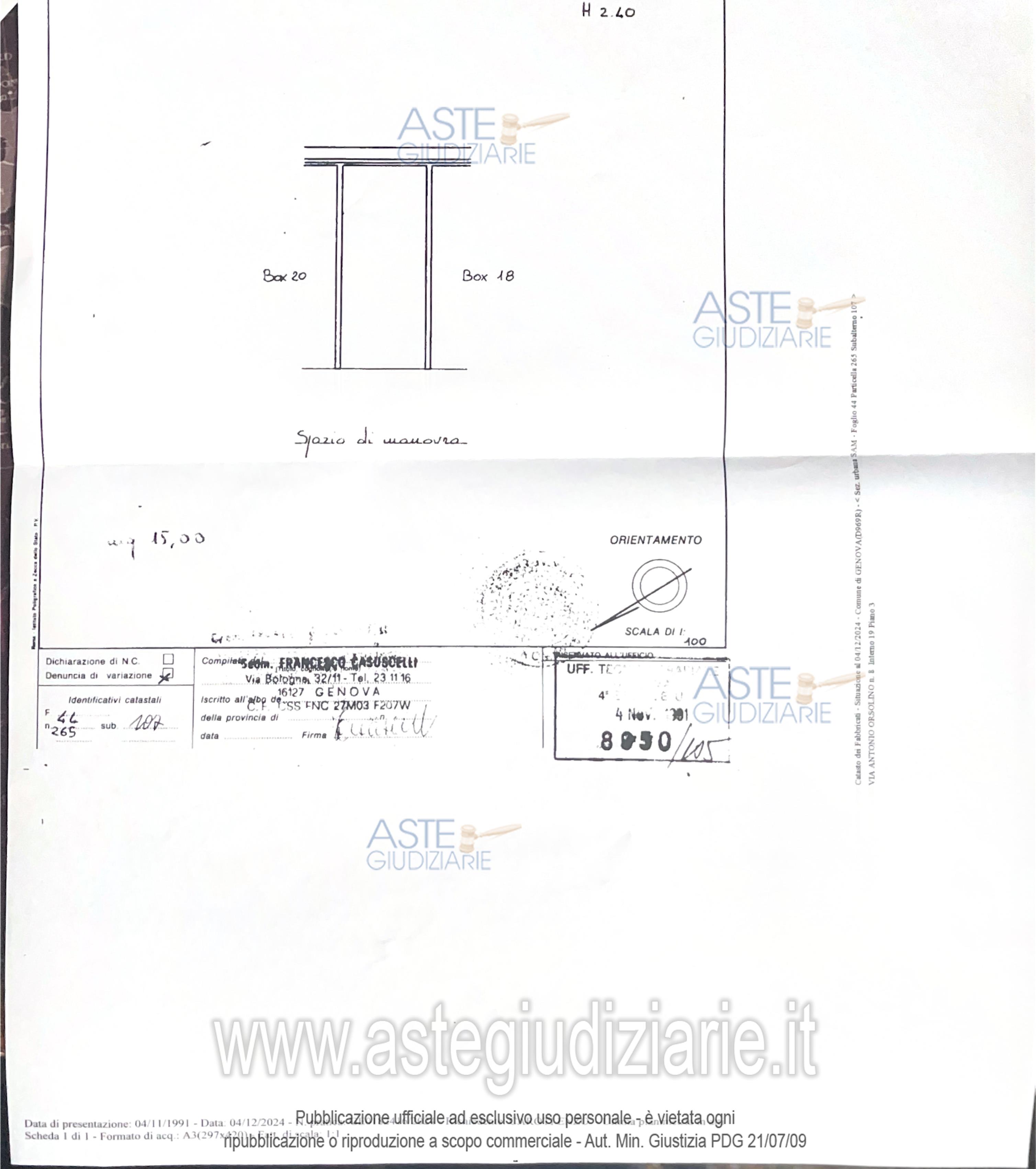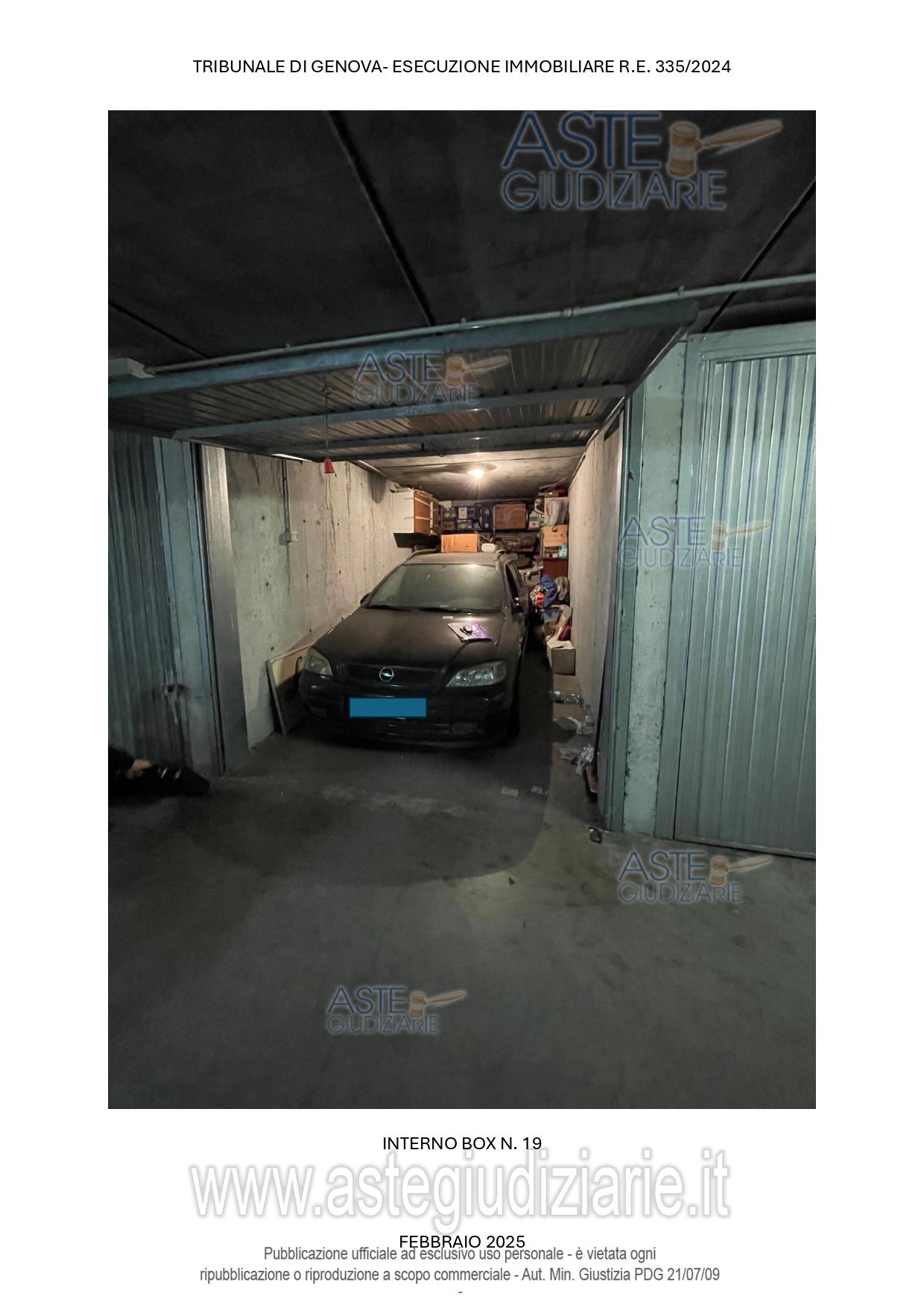 Vendita all'asta Senza incanto, con gara telematica sincrona mista - LOTTO UNICO: Il box è situato all'interno di un autoparcheggio nel quartiere di Sampierdarena, con accesso da Via Carzino, La costruzione è interamente adibita ad autorimesse ad uso privato, con cancelli automatizzati di accesso e rampe di collegamento ai piani: il garage in questione è dotato di serranda basculante in alluminio. Prezzo base € 17.869,50 (offerta minima € 13.402,13). Data vendita 12/06/2026 ore 15:00. Giudice Dott. Chiara Monteleone. Professionista delegato alla vendita Avv. Stefano Roveta - Email "stefano.roveta@boccardoroveta.it"; Tel. 010885617. Custode Giudiziario Dott. Sovemo Srl - Email "visitegenova@sovemo.com"; Tel. 0105299253. Rif. Tribunale di Genova - Espropriazione immobiliare (cartabia) n. 335/2024