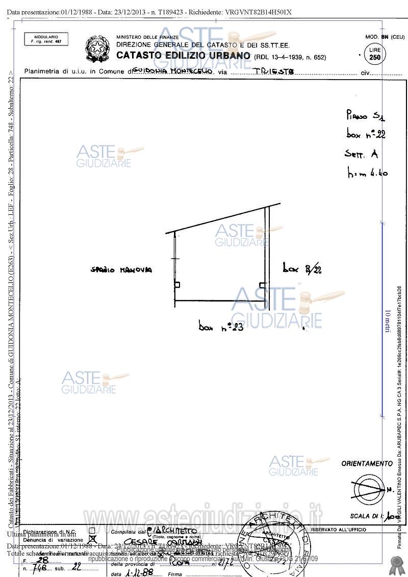 Vendita all'asta Senza incanto, con gara telematica asincrona - LOTTO 20: Quota pari ad 1/1 del diritto di proprietà su box auto in autorimessa situato nel Comune Guidonia Montecelio, Loc. Villalba, accessibile da Largo Trieste snc, piano sottostrada, settore A individuato con il numero 23, per complessivi mq 16. Prezzo base € 1.814,06 (offerta minima € 1.360,54). Data inizio operazioni di vendita: 29/12/2025 ore 15:00. Giudice Dott. Marco Piovano. Professionista delegato alla vendita Avv. Corrado Testa. Custode Giudiziario Ivg Di Roma Srl - Email "pvp@visiteivgroma.it"; Tel. 0689569801. Rif. Tribunale di Tivoli - Esecuzione immobiliare post legge 80 n. 516/2011