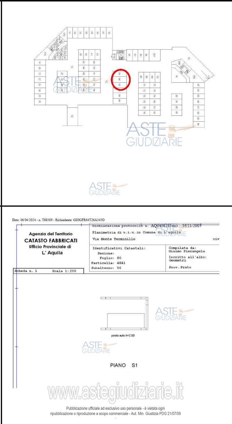 Vendita all'asta Senza incanto, con gara telematica asincrona - LOTTO 24: Posto auto coperto posto al livello -1 di un edificio costituito da cinque livelli fuori terra (oltre un sottotetto) e due interrati. Prezzo base € 9.000,00 (offerta minima € 7.200,00). Data inizio operazioni di vendita: 23/06/2026 ore 09:00. Giudice Dott. Gabriele Quaranta. Professionista delegato alla vendita Avv. Fabrizio Fiore - Email "fabrizio.fiore22@virgilio.it"; Cell. 3402734421. Custode Giudiziario Istituto Vendite Giudiziarie Abruzzo - Email "ivgavezzano@gmail.com"; Tel. 08631940168. Rif. Tribunale di L'Aquila - Esecuzione immobiliare post legge 80 n. 6/2023