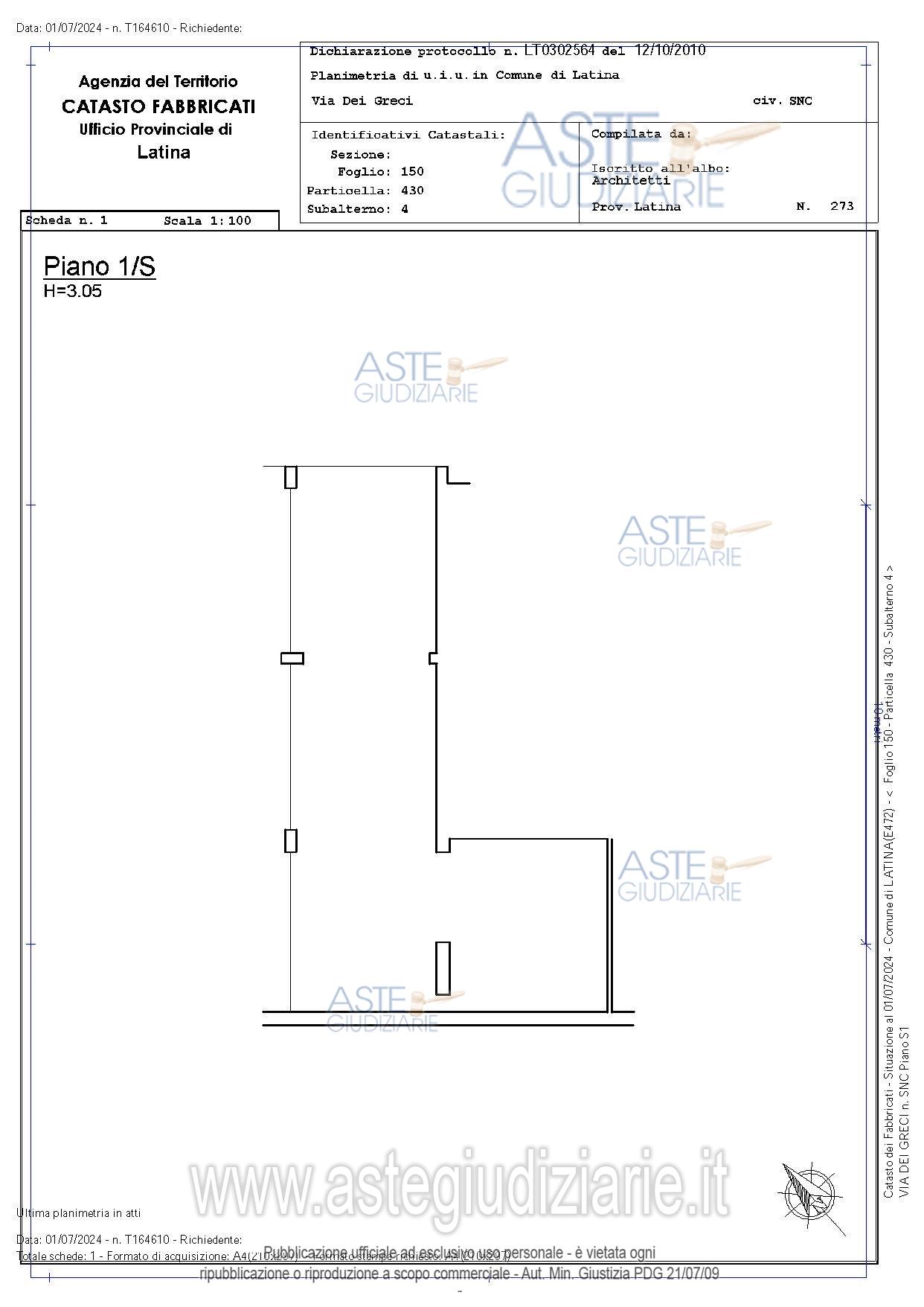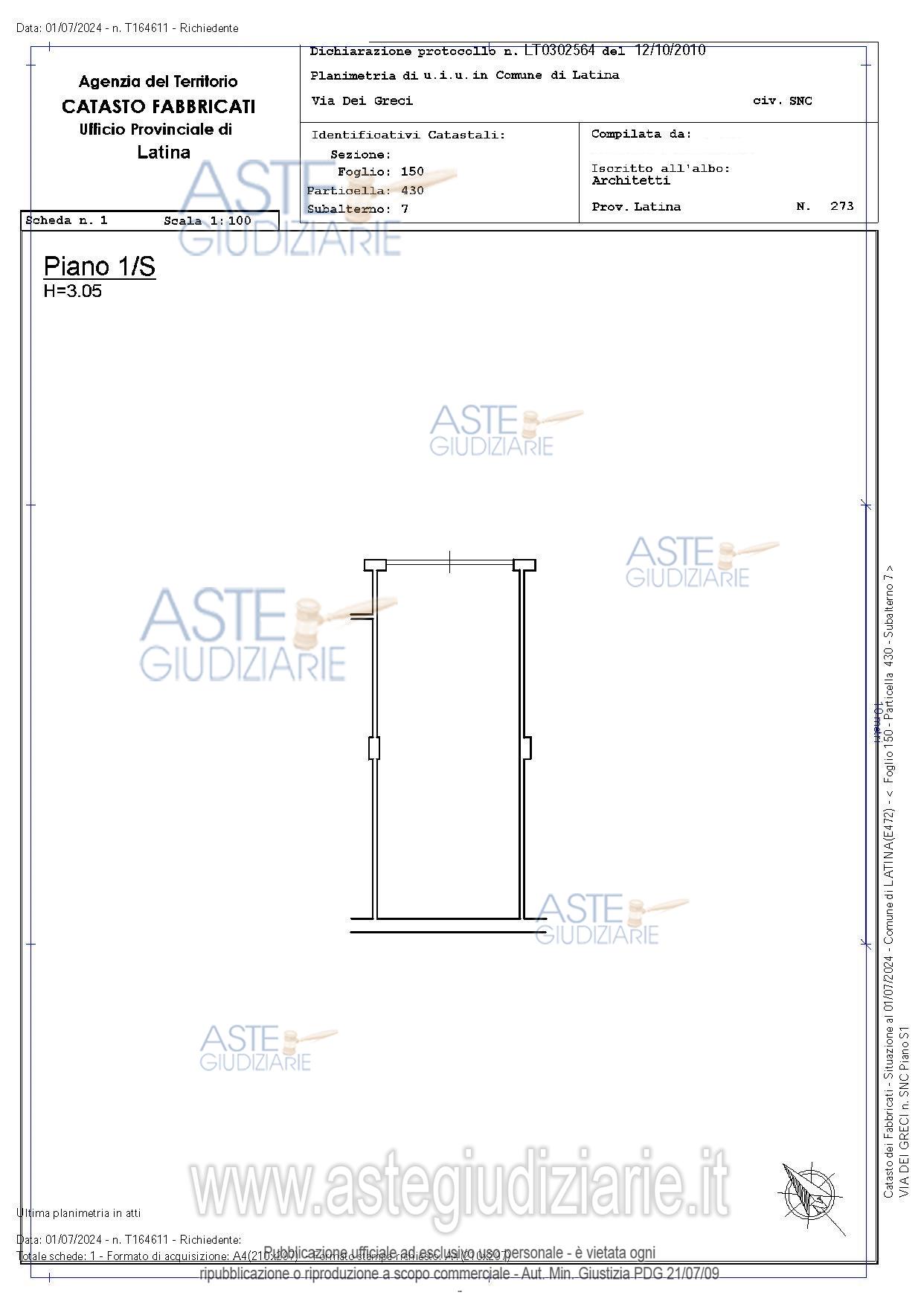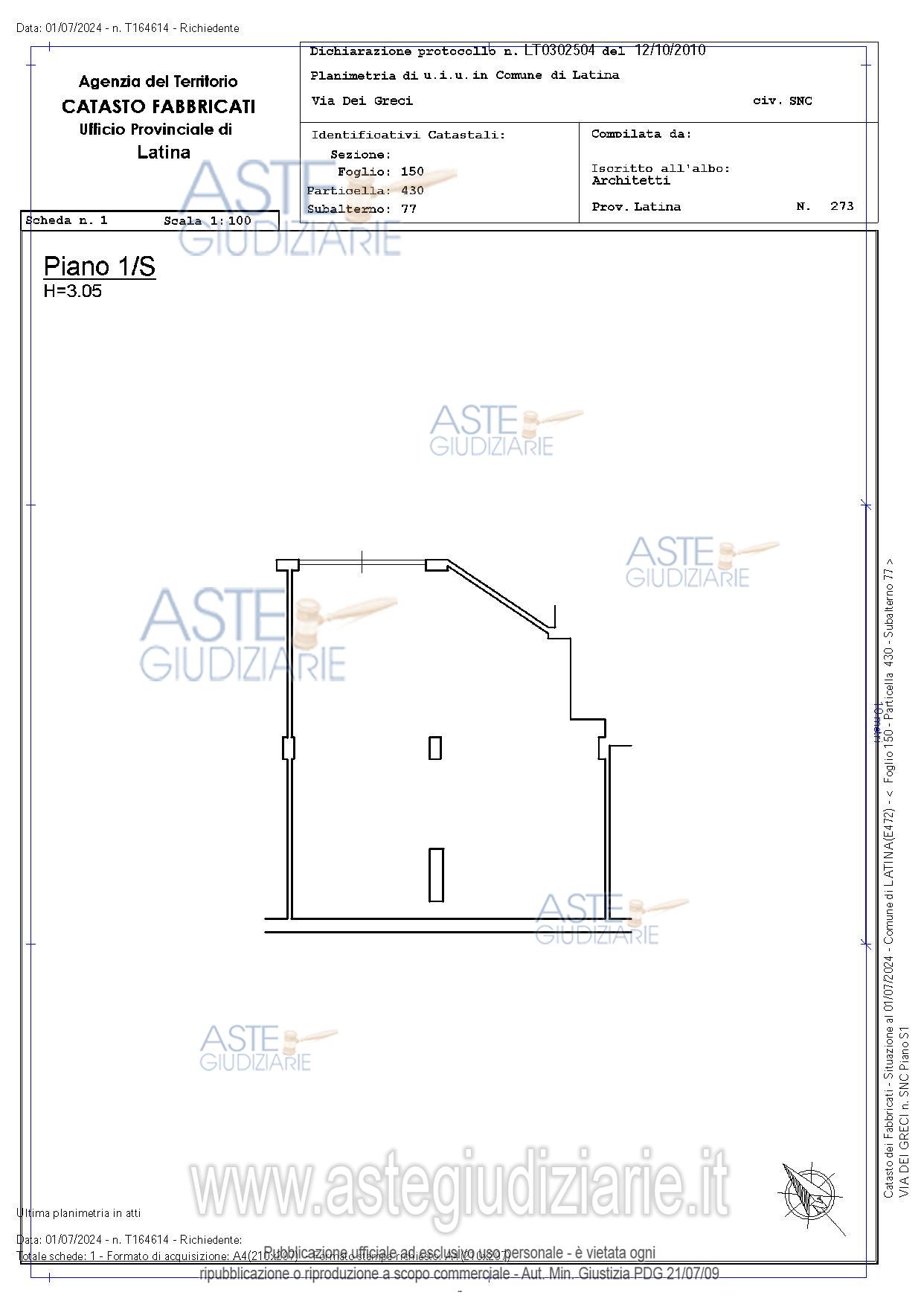 Vendita all'asta Senza incanto, con gara telematica asincrona - LOTTO Unico: Full and perfect ownership of the real estate portfolio consisting of five storage units and a garage, located in the basement of the main building at Via dei Greci s.n.c., in the Piccarello area. Prezzo base € 29.443,59 (offerta minima € 23.554,87). Data inizio operazioni di vendita: 23/04/2026 ore 10:00. In caso di più offerte valide si procederà a gara che inizierà il 23/04/2026 ore 10:00 e terminerà il 30/04/2026 ore 10:00. Giudice Dott. Tiziana Tinessa. Professionista delegato alla vendita Dott. Michele Saggese - Tel. 081 5513144. Curatore Dott. Michele Saggese. Rif. Tribunale di Latina - Fallimentare (nuovo rito) n. 112/2012