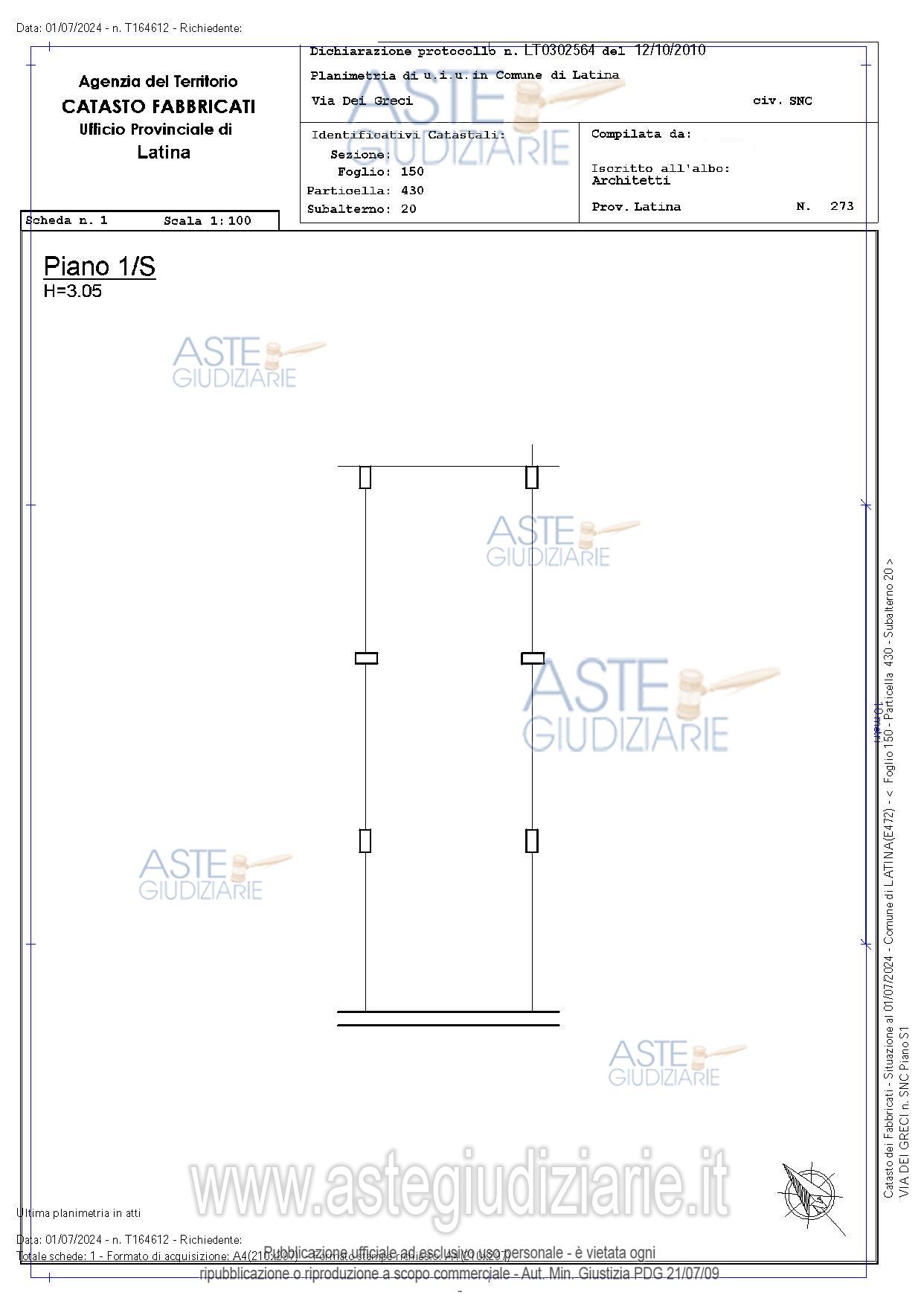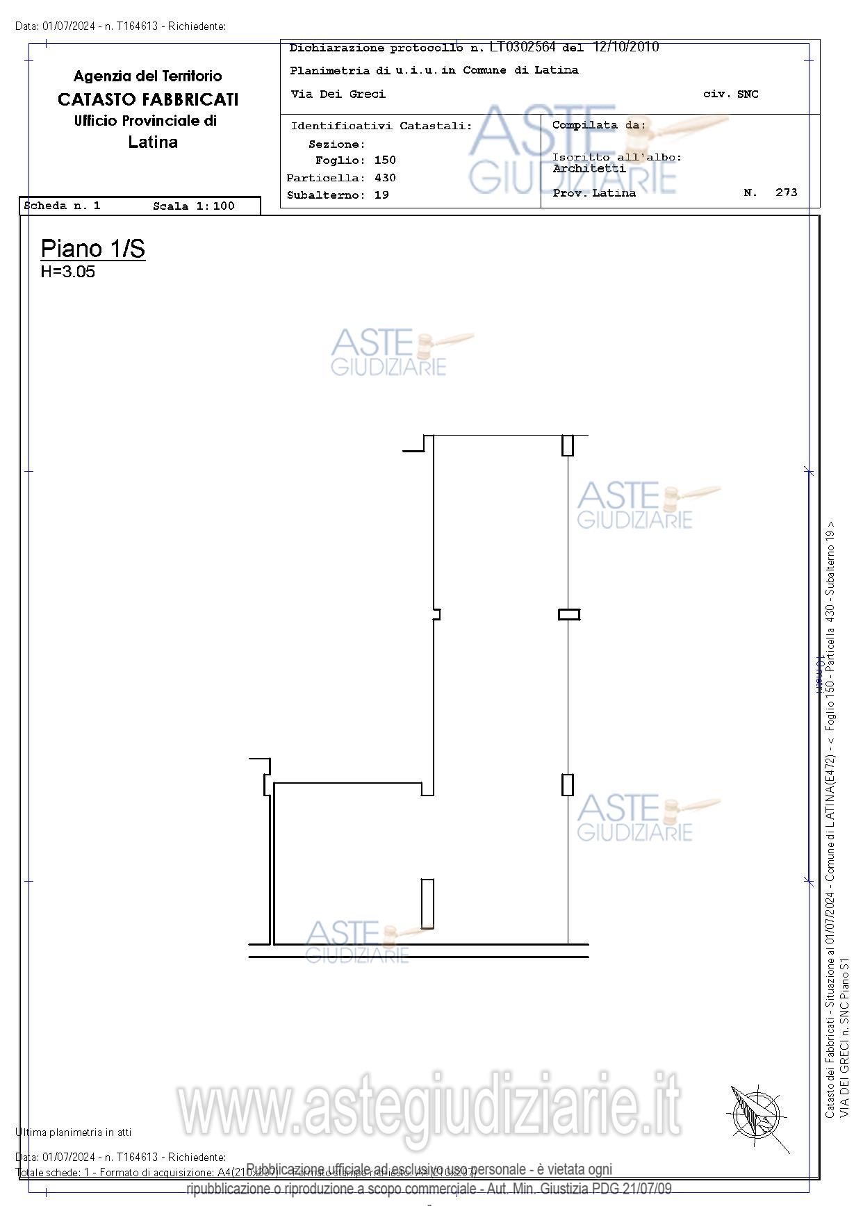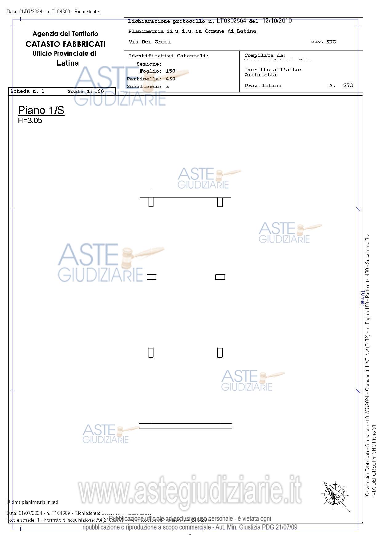 Vendita all'asta Senza incanto, con gara telematica asincrona - LOTTO Unico: Full and perfect ownership of the real estate portfolio consisting of five storage units and a garage, located in the basement of the main building at Via dei Greci s.n.c., in the Piccarello area. Prezzo base € 29.443,59 (offerta minima € 23.554,87). Data inizio operazioni di vendita: 23/04/2026 ore 10:00. In caso di più offerte valide si procederà a gara che inizierà il 23/04/2026 ore 10:00 e terminerà il 30/04/2026 ore 10:00. Giudice Dott. Tiziana Tinessa. Professionista delegato alla vendita Dott. Michele Saggese - Tel. 081 5513144. Curatore Dott. Michele Saggese. Rif. Tribunale di Latina - Fallimentare (nuovo rito) n. 112/2012