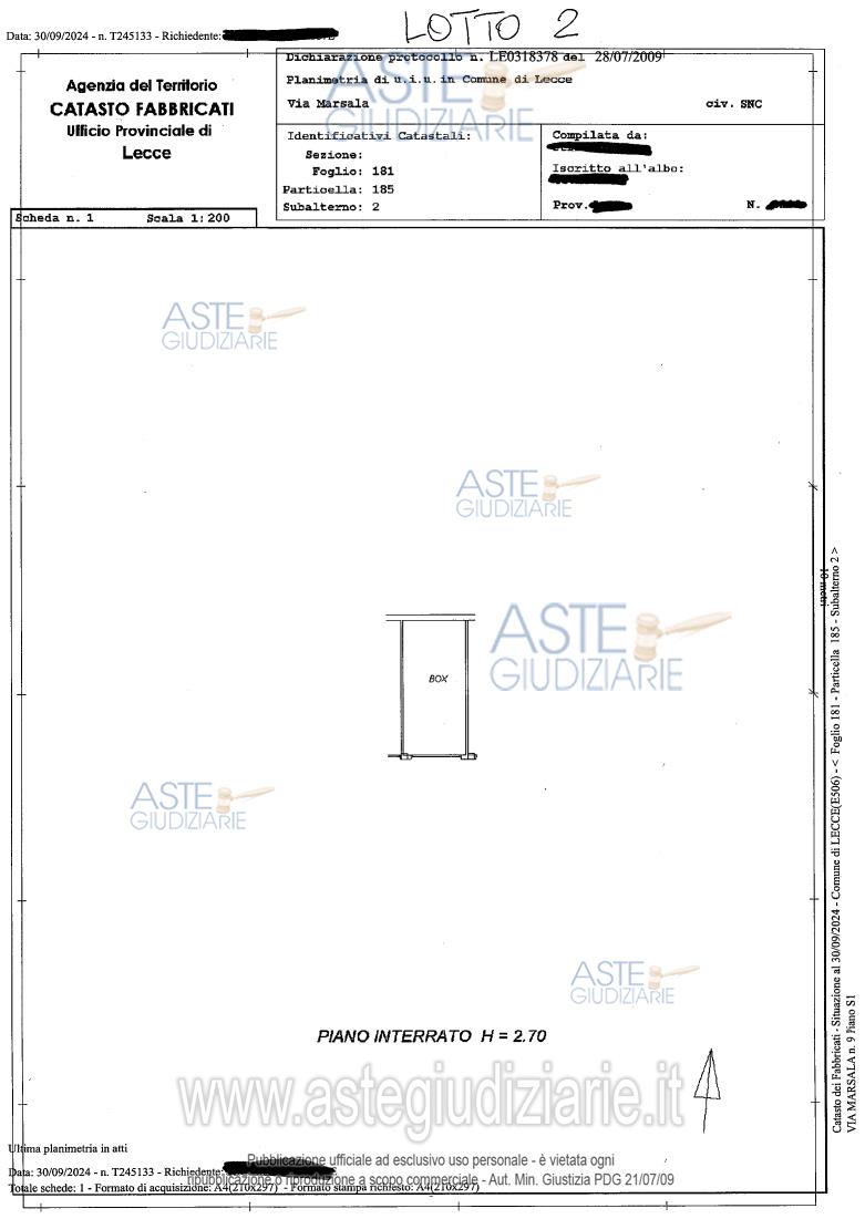 Vendita all'asta Senza incanto, con gara telematica asincrona - LOTTO 2: Box singolo a LECCE via Marsala 9, della superficie commerciale di 12,00 mq per la quota di 100/100 di piena proprietà. Il cespite in stima è posto al piano interrato ed è destinato a box-auto con sottoscala di pertinenza. Prezzo base € 5.385,00 (offerta minima € 4.040,00). Data inizio operazioni di vendita: 18/11/2025 ore 12:00. Professionista delegato alla vendita Avv. Antonio Cerfeda - Email "avv.cerfeda@libero.it"; Cell. 3393073216; Tel. 3393073216. Custode Giudiziario Avv. Antonio Cerfeda - Email "avv.cerfeda@libero.it"; Cell. 3393073216; Tel. 3393073216. Rif. Tribunale di Lecce - Espropriazione immobiliare (cartabia) n. 218/2024