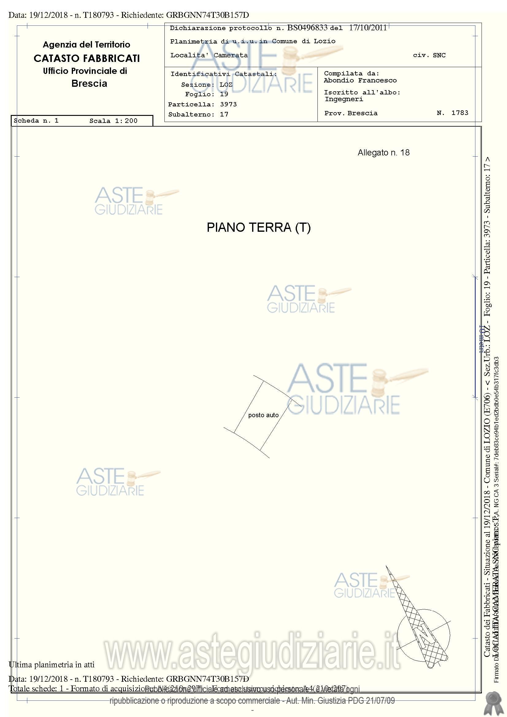 Vendita all'asta Senza incanto, con gara telematica asincrona - LOTTO 13: Piena proprietà. Trattasi, ex perizia, di posto auto scoperto al piano terra, il tutto censito al Catasto Fabbricati - Sez. LOZ - Fg. 19 mapp. 3973 sub 17 P. T, cat. C6 - mq. 14con le proporzionali quote delle parti comuni ai sensi di legge. Prezzo base € 2.015,51 (offerta minima € 1.511,63). Data inizio operazioni di vendita: 06/05/2026 ore 10:30. Giudice Dellesecuzione Giudice. Professionista delegato alla vendita Not. Francesco Ambrosini. Custode Giudiziario Dott. Istituto Di Vendite Giudiziarie Soccov Srl - Email "ivgbrescia@ivgbrescia.com"; Tel. 030348410. Rif. Tribunale di Brescia - Esecuzione immobiliare post legge 80 n. 1379/2017