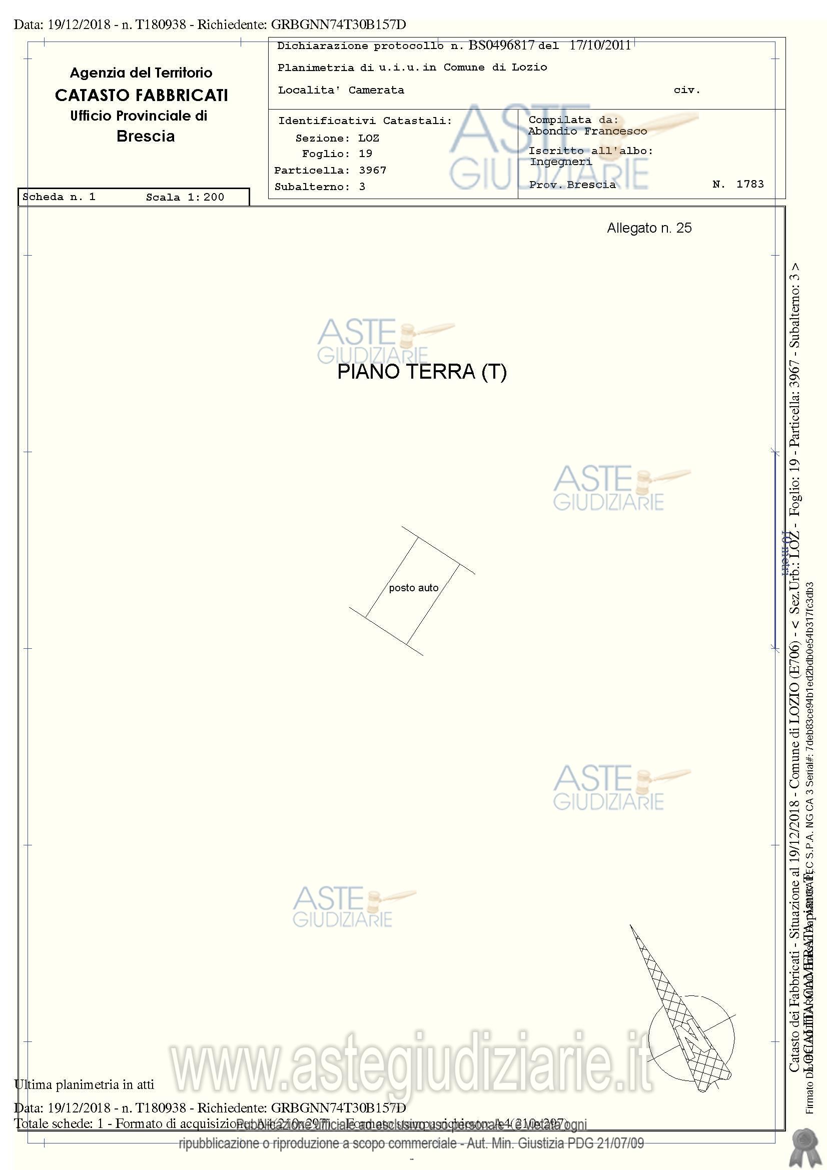 Vendita all'asta Senza incanto, con gara telematica asincrona - LOTTO 19: Piena proprietà. Trattasi, ex perizia, di posto auto scoperto al piano terra, il tutto censito al Catasto Fabbricati - Sez. LOZ - Fg. 19 mapp. 3967 sub 3 P. T, cat. C6 - mq. 12con le proporzionali quote delle parti comuni ai sensi di legge. Prezzo base € 1.328,91 (offerta minima € 996,68). Data inizio operazioni di vendita: 06/05/2026 ore 10:30. Giudice Dellesecuzione Giudice. Professionista delegato alla vendita Not. Francesco Ambrosini. Custode Giudiziario Dott. Istituto Di Vendite Giudiziarie Soccov Srl - Email "ivgbrescia@ivgbrescia.com"; Tel. 030348410. Rif. Tribunale di Brescia - Esecuzione immobiliare post legge 80 n. 1379/2017