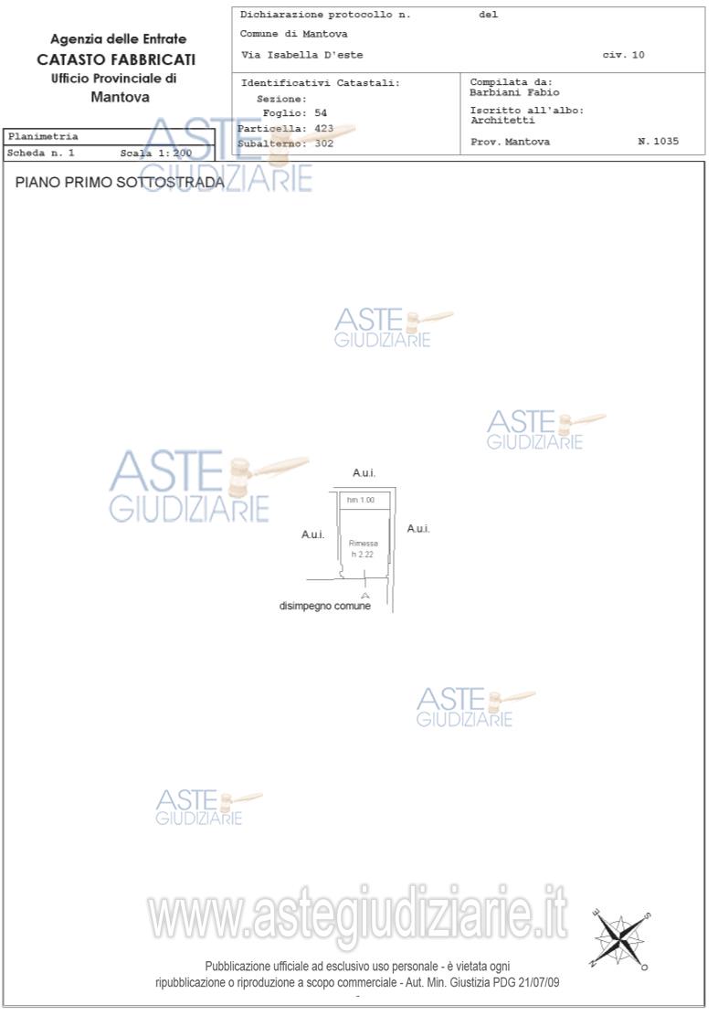 Vendita all'asta Senza incanto, con gara telematica sincrona mista - LOTTO 2: Autorimessa in Mantova (MN) Via Isabella D'Este 10, sviluppata in un unico ambiente al piano interrato, inserito in contesto condominiale, con accesso attraverso il disimpegno comune che tramite rampa si collega al cortile comune e relativo cancello carraio che svuota su pubblica via. Identificazione al Catasto Fabbricati del Comune di Mantova:Fg. 54, Part. 423, Sub 302, Categoria C/6, Cl. 5, Consistenza 10 mq, Sup.Cat. 11 mq, Piano S1, R.C. euro 38,73. Prezzo base € 12.193,00 (offerta minima € 9.145,00). Data vendita 19/12/2025 ore 14:00. Professionista delegato alla vendita Dott. Rosa Russo - Email "studiorosarusso@gmail.com"; Cell. 3474956886; Tel. 0376534499. Custode Giudiziario So.Ve.Mo. Srl - Email "immobiliaremantova@sovemo.com"; Tel. 0376220694. Rif. Tribunale di Mantova - Esecuzione immobiliare post legge 80 n. 18/2023