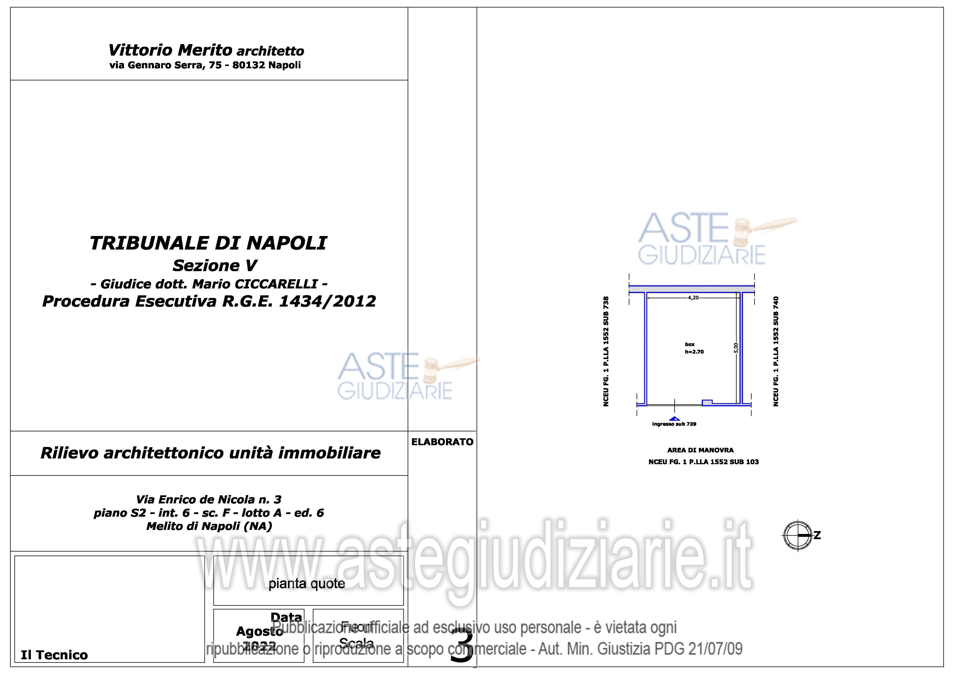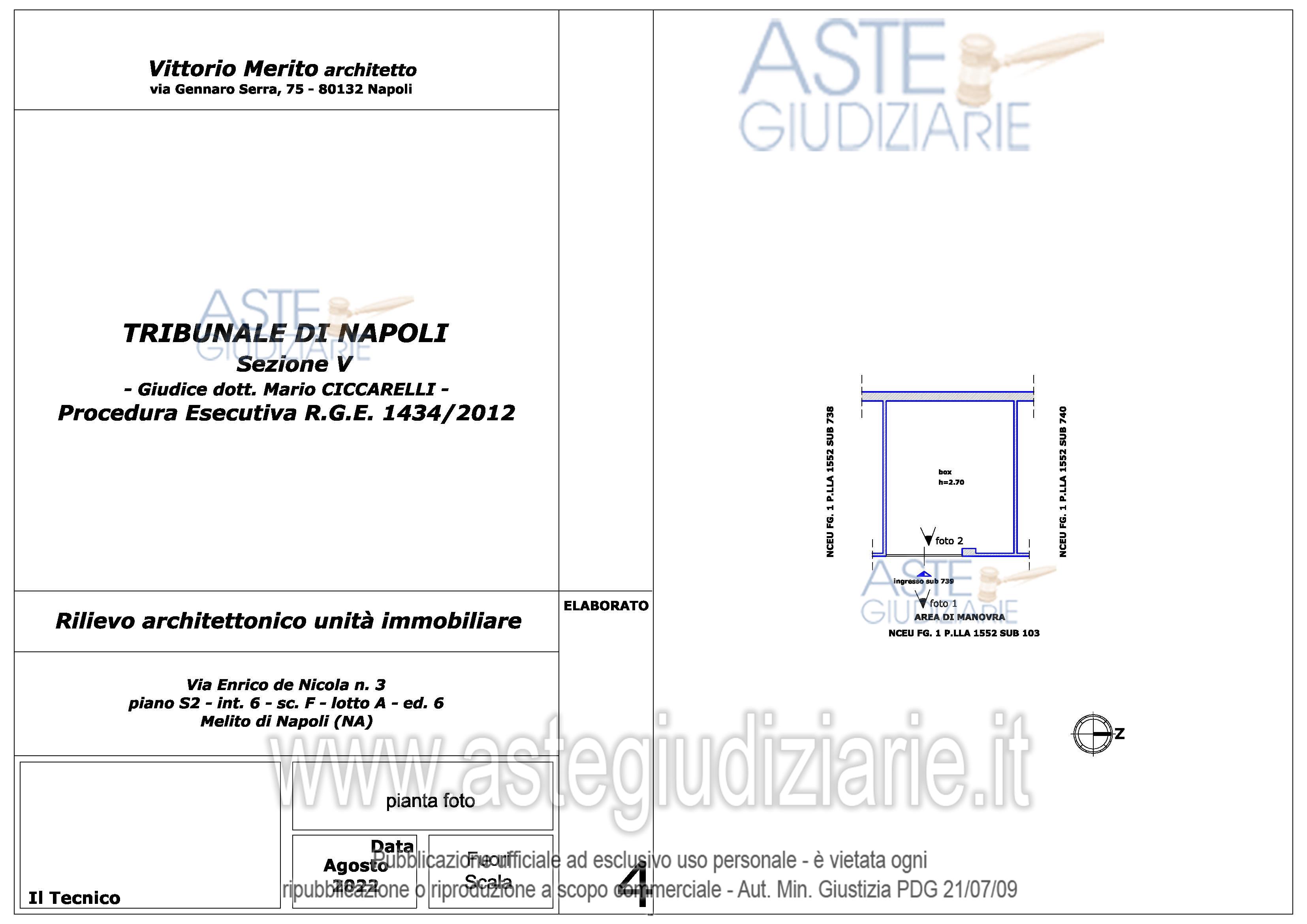 Vendita all'asta Senza incanto, con gara telematica asincrona - LOTTO 38: Piena e intera proprietà del seguente immobile sito in Melito di Napoli alla Via Enrico de Nicola n° 3 – Parco Aurora: Box ubicato al piano S2, interno 6, scala F, lotto A, edificio 6, sup. cat. 23 mq. Prezzo base € 2.030,00 (offerta minima € 1.523,00). Data inizio operazioni di vendita: 21/10/2025 ore 15:30. Giudice Ciccarelli. Professionista delegato alla vendita Avv. Valeria Collicelli - Email "valcollicelli@yahoo.it"; Cell. 3292619009. Custode Giudiziario Avv. Valeria Collicelli - Email "valcollicelli@yahoo.it"; Cell. 3292619009. Rif. Tribunale di Napoli - Esecuzione immobiliare post legge 80 n. 1434/2012