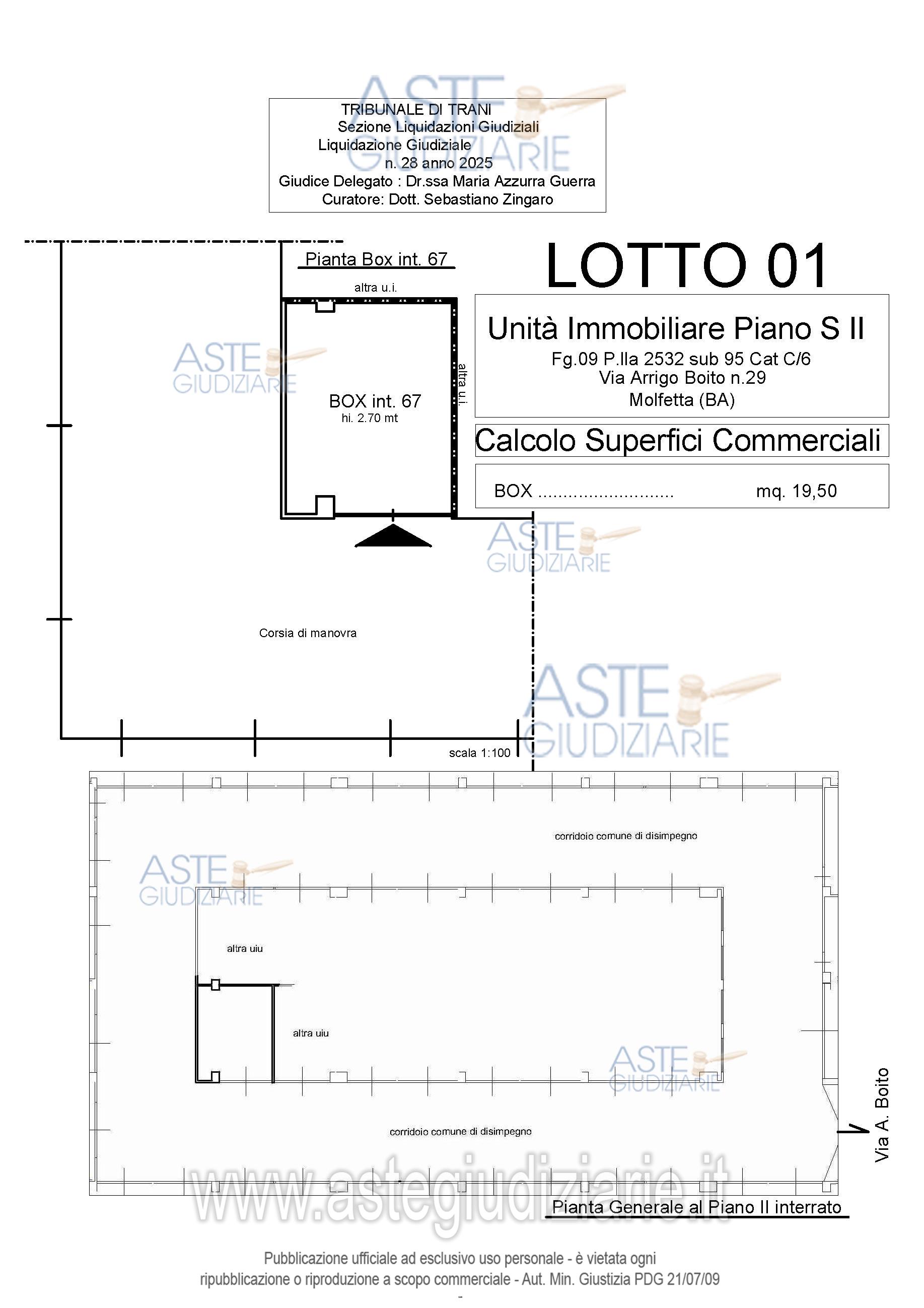Vendita all'asta Senza incanto, con gara telematica sincrona - LOTTO 1: Box situé au deuxième sous-sol, équipé d'un volet métallique électrique et d'une installation électrique aux normes, mais dépourvu d'installation d'eau et d'assainissement, et doté d'un revêtement de sol en béton de type industriel. La propriété, de construction récente, est en excellent état de conservation. Prezzo base € 21.450,00 (offerta minima € 16.087,50). Data vendita 28/04/2026 ore 11:00. Giudice Dott. Maria Azzurra Guerra. Professionista delegato alla vendita Dott. Sebastiano Zingaro - Tel. 0883 596106. Curatore Dott. Sebastiano Zingaro. Rif. Tribunale di Trani - Liquidazione giudiziale(cci) n. 28/2025