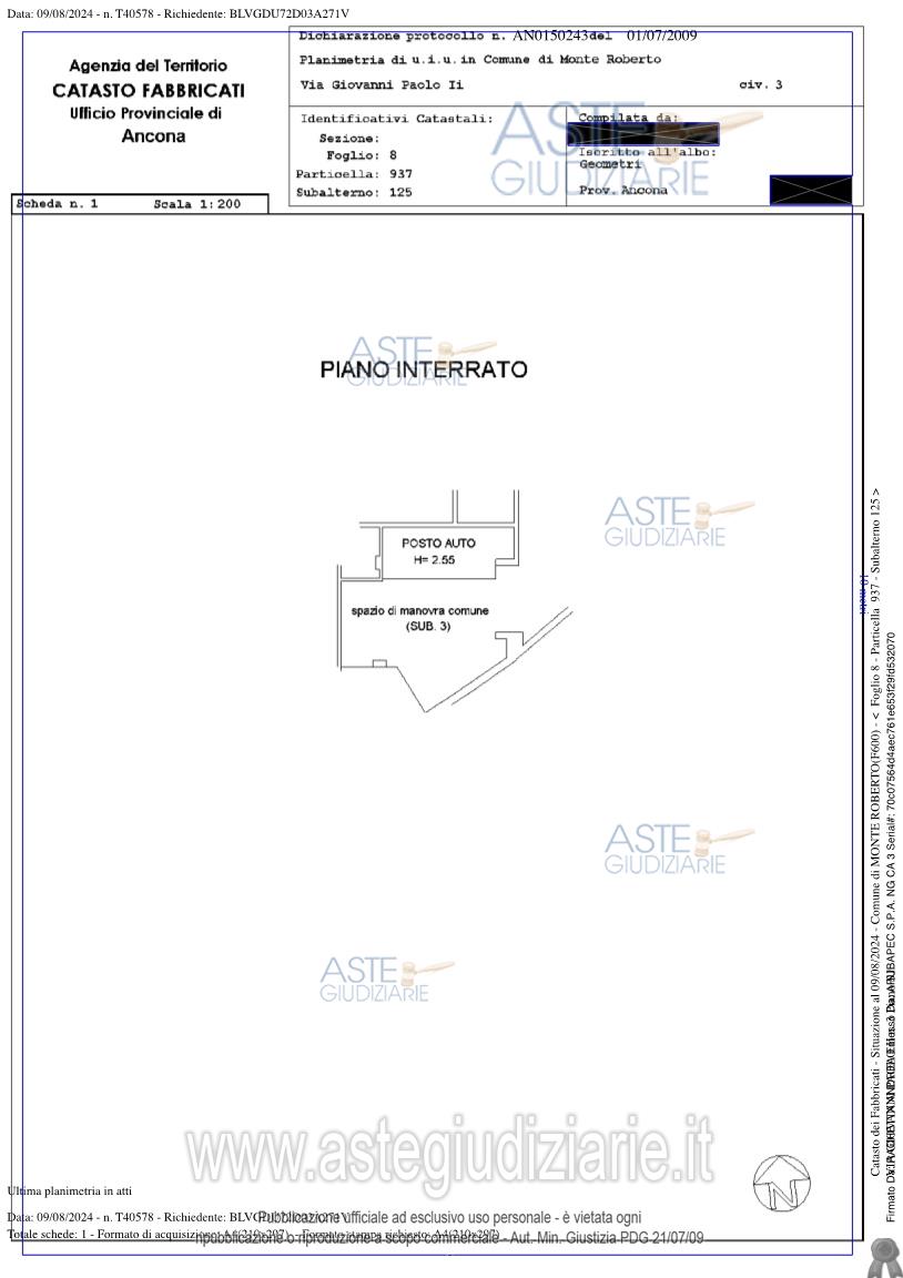 Vendita all'asta Senza incanto, con gara telematica asincrona - LOTTO 59: Piena proprietà (1/1) di porzione di fabbricato sito a Monte Roberto (An) costituita da posto auto situato al piano interrato con ingresso da via Giovanni Paolo II n 3 (bene n 85). Prezzo base € 3.038,00 (offerta minima € 2.279,00). Data inizio operazioni di vendita: 11/12/2025 ore 12:00. Professionista delegato alla vendita Avv. Ubaldo Sassaroli - Email "sassaroli@sassarolipica.it"; Tel. 0712900706. Custode Giudiziario Avv. Gianluca Spinsanti - Email "g.spinsanti@studiolegalerossini.eu"; Tel. 0712075613. Rif. Tribunale di Ancona - Espropriazione immobiliare (cartabia) n. 41/2024
