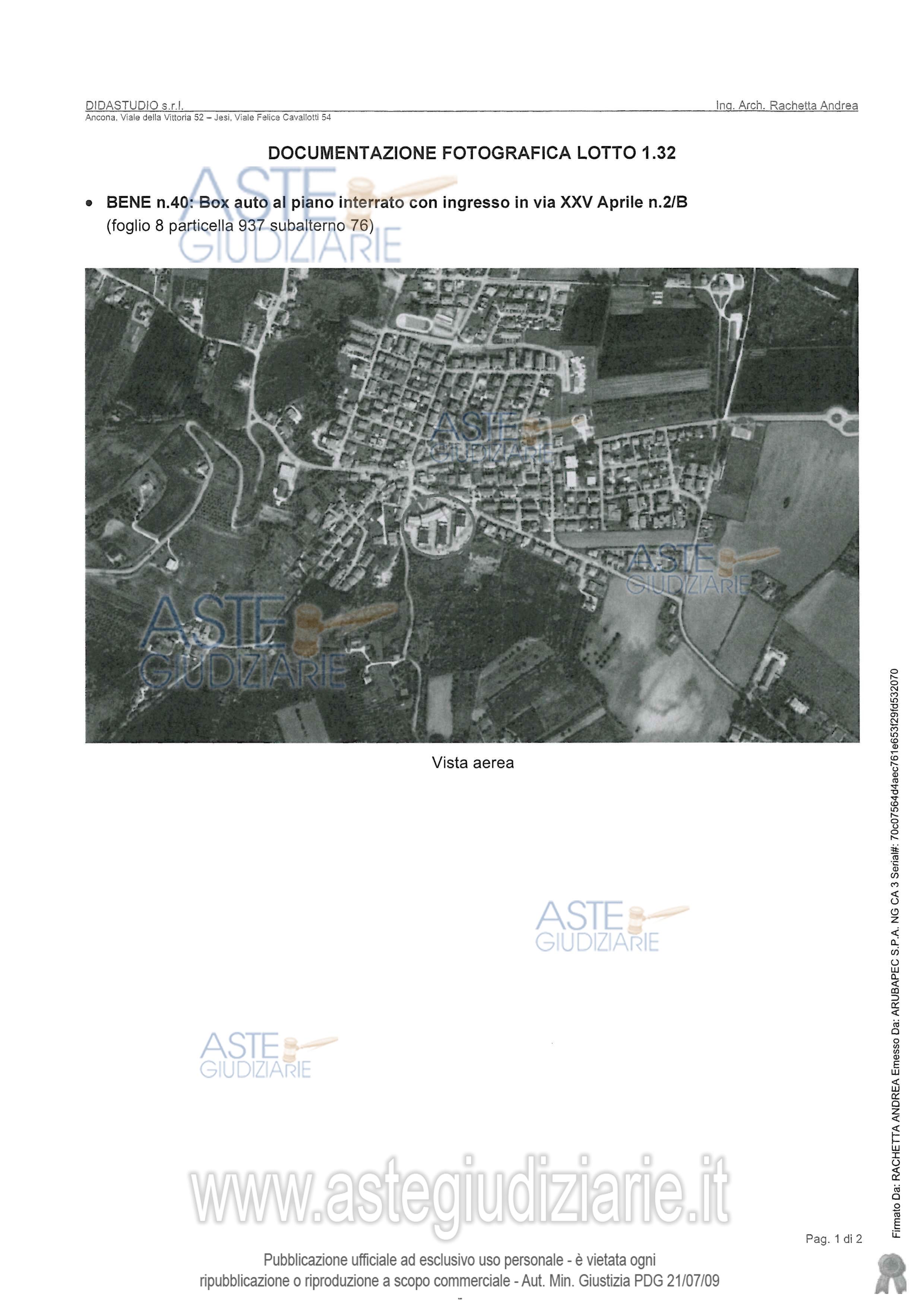 Vendita in attesa dell'emissione del nuovo bando d'asta. LOTTO 32: LOTTO 32 (in perizia lotto 1.32).Box auto (bene n. 40), posto al piano interrato, avente un doppio accesso carrabile su Via XXV Aprile e su via Giovanni Paolo II. Ultimo prezzo base € 4.387,00 (offerta minima € 3.290,00). Giudice Giuliana Filippello. Professionista delegato alla vendita Not. Luigi Olmi - Email "esecuzioni@studionotarilebucciolmi.it"; Tel. 071206866. Custode Giudiziario Avv. Gianluca Spinsanti - Email "g.spinsanti@studiolegalerossini.eu"; Tel. 0712075613. Rif. Tribunale di Ancona - Espropriazione immobiliare (cartabia) n. 41/2024