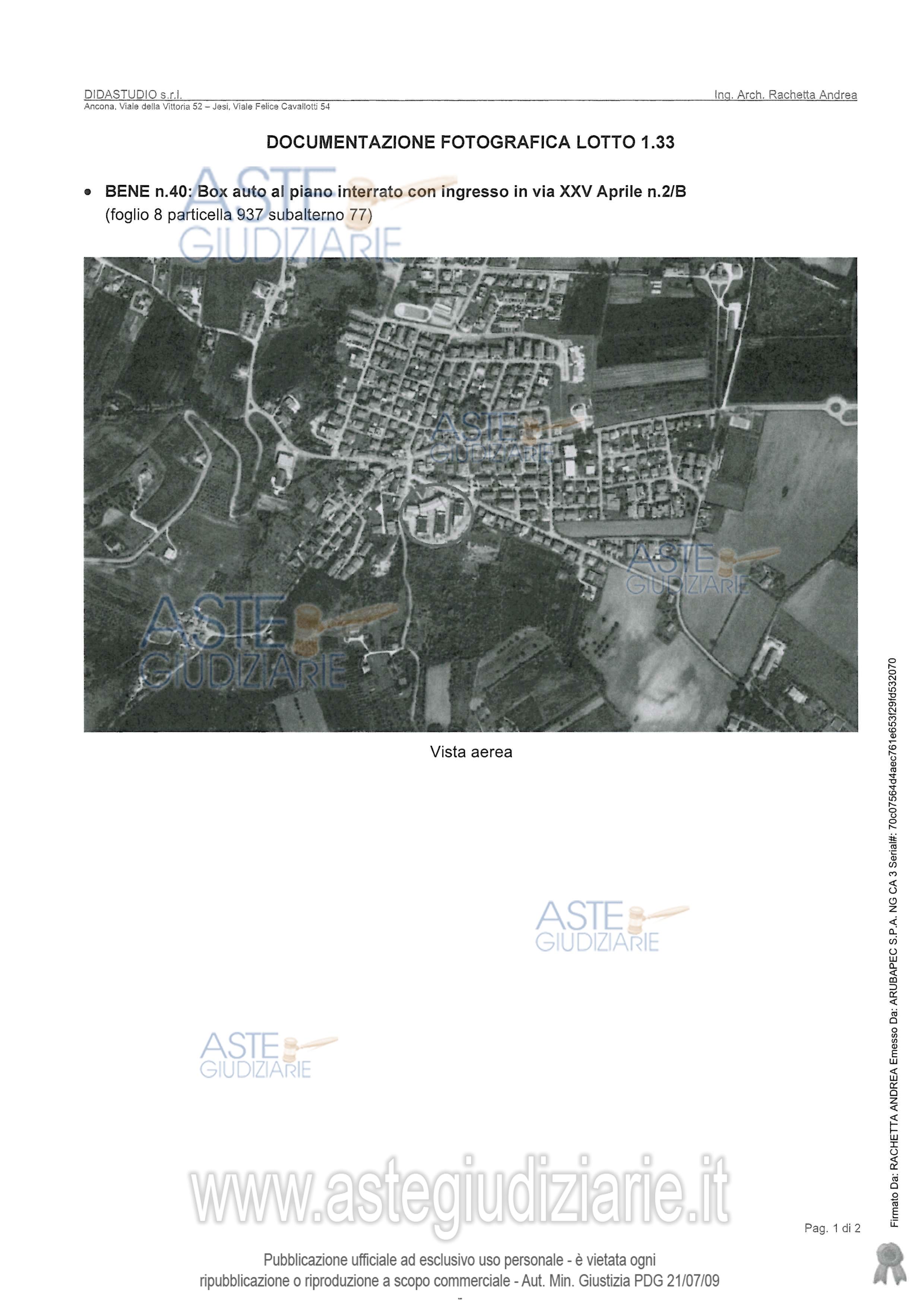 Vendita in attesa dell'emissione del nuovo bando d'asta. LOTTO 33: LOTTO 33 (in perizia lotto 1.33).Box auto (bene n. 41), posto al piano interrato, avente un doppio accesso carrabile su Via XXV Aprile e su via Giovanni Paolo II. Ultimo prezzo base € 4.500,00 (offerta minima € 3.375,00). Giudice Giuliana Filippello. Professionista delegato alla vendita Not. Luigi Olmi - Email "esecuzioni@studionotarilebucciolmi.it"; Tel. 071206866. Custode Giudiziario Avv. Gianluca Spinsanti - Email "g.spinsanti@studiolegalerossini.eu"; Tel. 0712075613. Rif. Tribunale di Ancona - Espropriazione immobiliare (cartabia) n. 41/2024