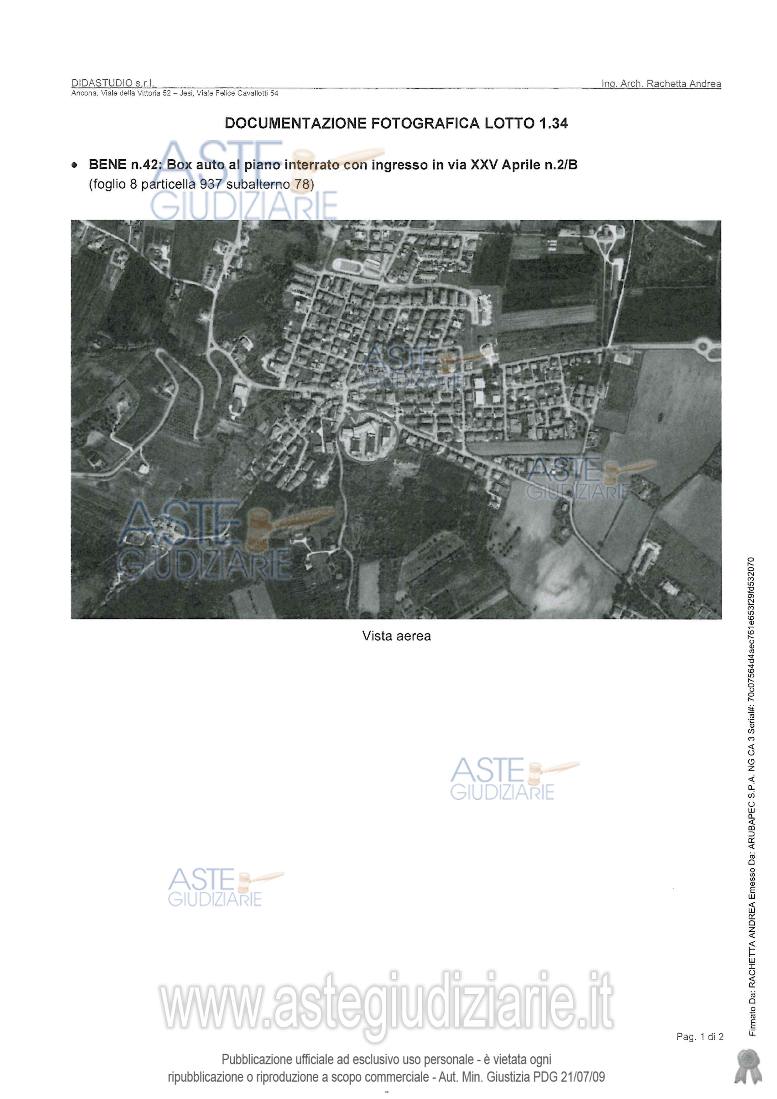 Vendita all'asta Senza incanto, con gara telematica asincrona - LOTTO 34: LOTTO 34 (in perizia lotto 1.34).Box auto (bene n. 42), posto al piano interrato, avente un doppio accesso carrabile su Via XXV Aprile e su via Giovanni Paolo II. Prezzo base € 7.256,00 (offerta minima € 5.442,00). Data inizio operazioni di vendita: 11/12/2025 ore 11:00. Giudice Giuliana Filippello. Professionista delegato alla vendita Not. Luigi Olmi - Email "esecuzioni@studionotarilebucciolmi.it"; Tel. 071206866. Custode Giudiziario Avv. Gianluca Spinsanti - Email "g.spinsanti@studiolegalerossini.eu"; Tel. 0712075613. Rif. Tribunale di Ancona - Espropriazione immobiliare (cartabia) n. 41/2024