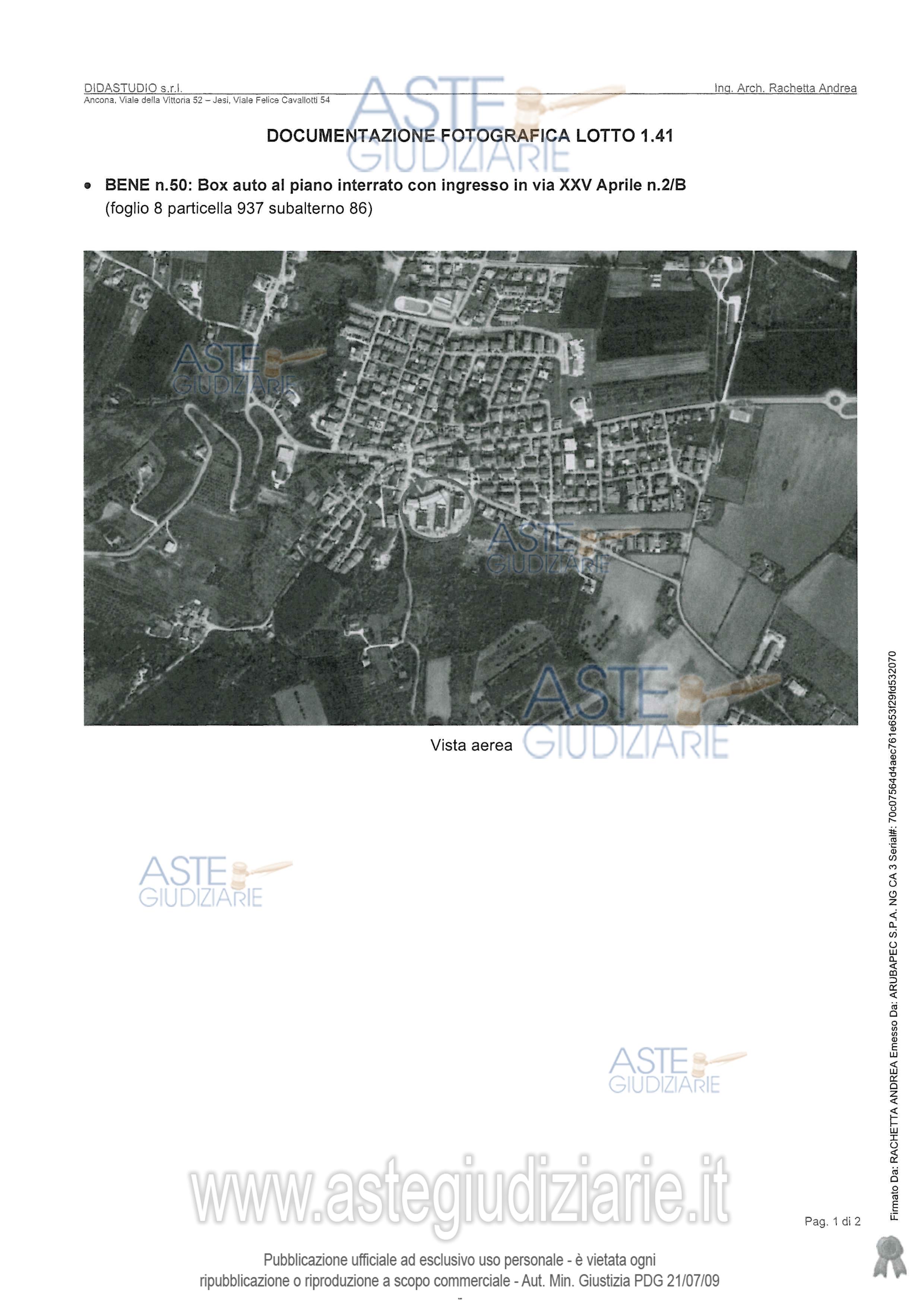 Vendita all'asta Senza incanto, con gara telematica asincrona - LOTTO 41: LOTTO 41 (in perizia lotto 1.41).Box auto (bene n. 50), posto al piano interrato, avente un doppio accesso carrabile su Via XXV Aprile e su via Giovanni Paolo II. Prezzo base € 10.350,00 (offerta minima € 7.763,00). Data inizio operazioni di vendita: 11/12/2025 ore 11:00. Giudice Giuliana Filippello. Professionista delegato alla vendita Not. Luigi Olmi - Email "esecuzioni@studionotarilebucciolmi.it"; Tel. 071206866. Custode Giudiziario Avv. Gianluca Spinsanti - Email "g.spinsanti@studiolegalerossini.eu"; Tel. 0712075613. Rif. Tribunale di Ancona - Espropriazione immobiliare (cartabia) n. 41/2024