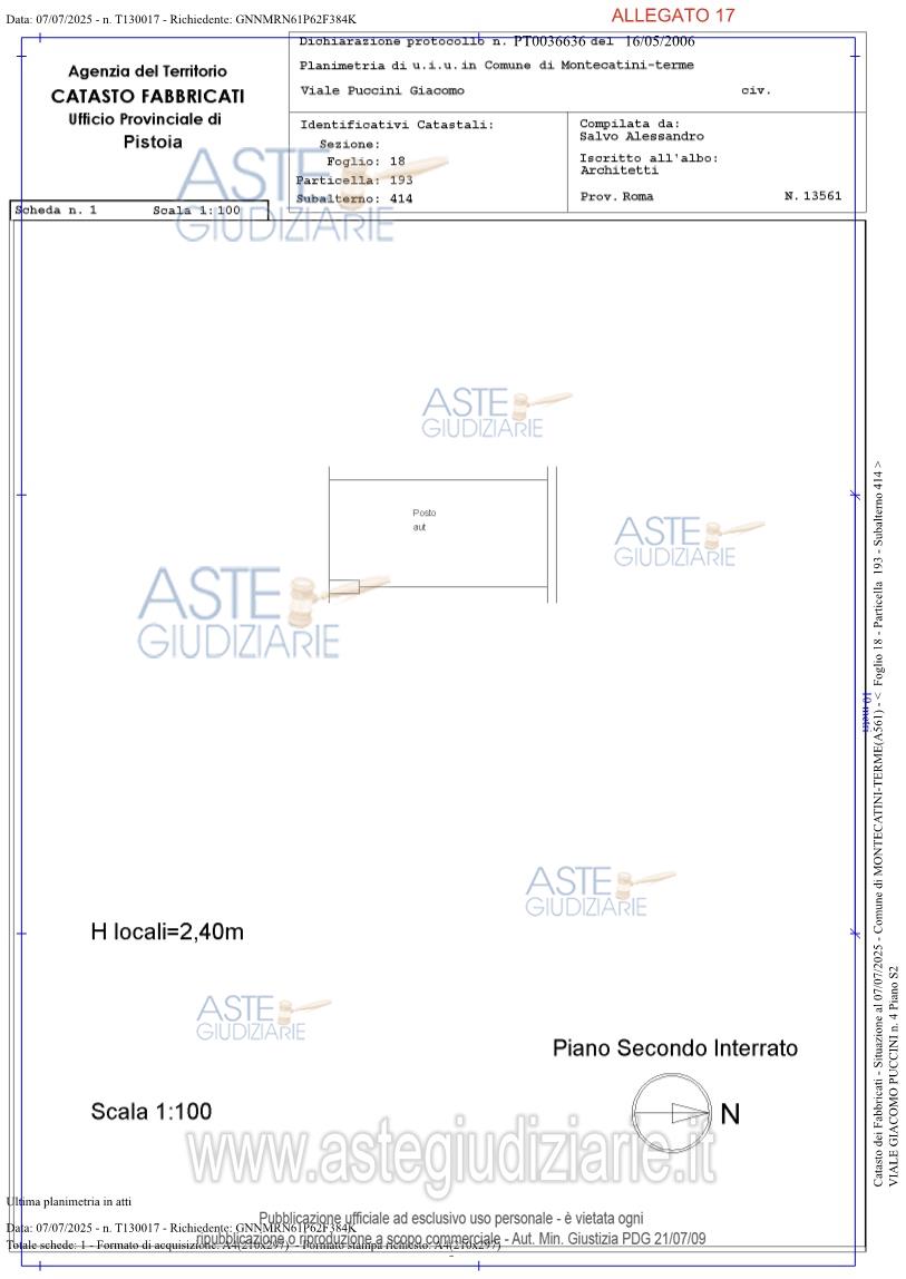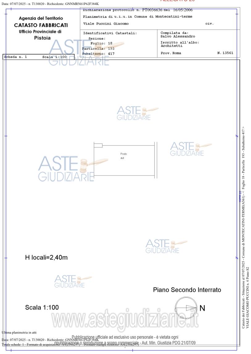 Vendita all'asta Senza incanto, con gara telematica asincrona - LOTTO 3: Posto auto al piano secondo interrato. Prezzo base € 8.400,00 (offerta minima € 6.300,00). Data inizio operazioni di vendita: 20/05/2026 ore 11:00. Giudice Nicoletta Maria Caterina Curci. Professionista delegato alla vendita Avv. Lucrezia Giachetti - Email "lucrezia.giachetti@gmail.com". Custode Giudiziario Isveg - Email "prenota.pt@isveg.it". Rif. Tribunale di Pistoia - Espropriazione immobiliare (cartabia) n. 80/2025
