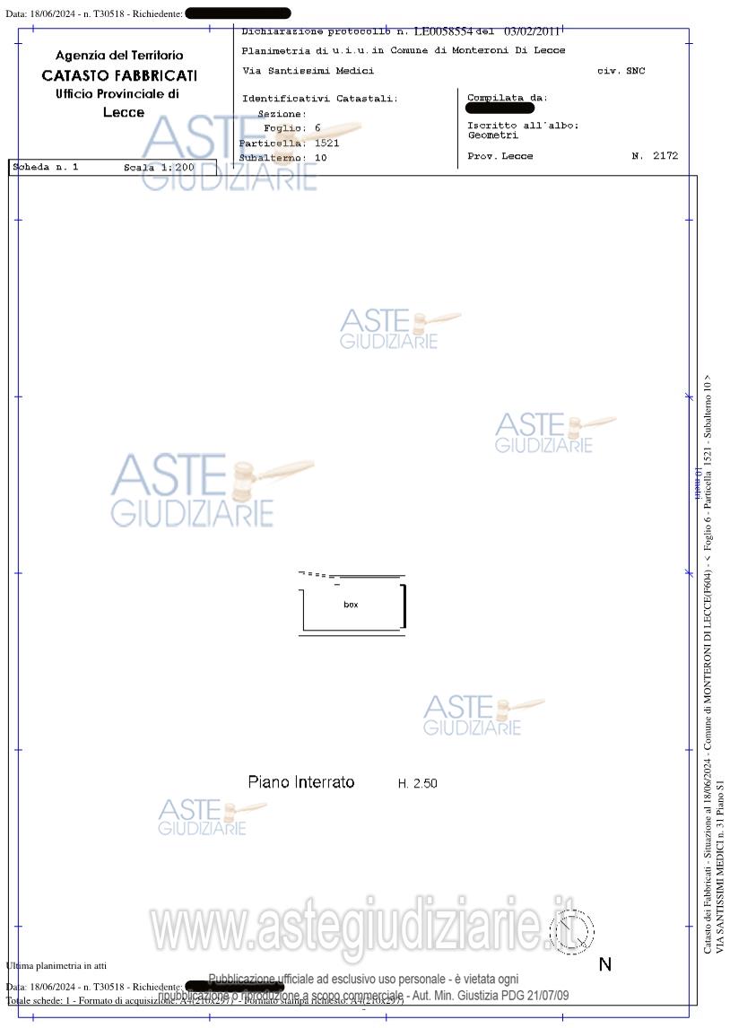 Vendita all'asta Senza incanto, con gara telematica asincrona - LOTTO 11: Quota di 1/1 di piena proprietà di box auto sito nel Comune di Monteroni di Lecce. Prezzo base € 4.238,00 (offerta minima € 3.179,00). Data inizio operazioni di vendita: 18/02/2026 ore 09:30. Professionista delegato alla vendita Avv. Danilo Walter Pedio - Email "avvocatopediodanilo@libero.it"; Cell. 3460459001; Tel. 3460459001. Custode Giudiziario Avv. Danilo Walter Pedio - Email "avvocatopediodanilo@libero.it"; Cell. 3460459001; Tel. 3460459001. Rif. Tribunale di Lecce - Espropriazione immobiliare (cartabia) n. 154/2024