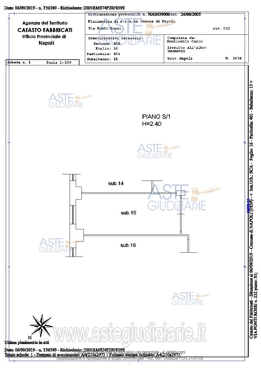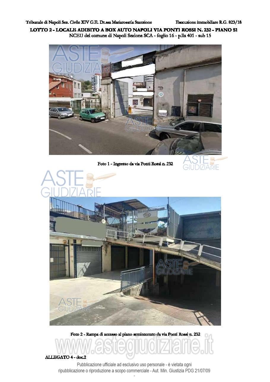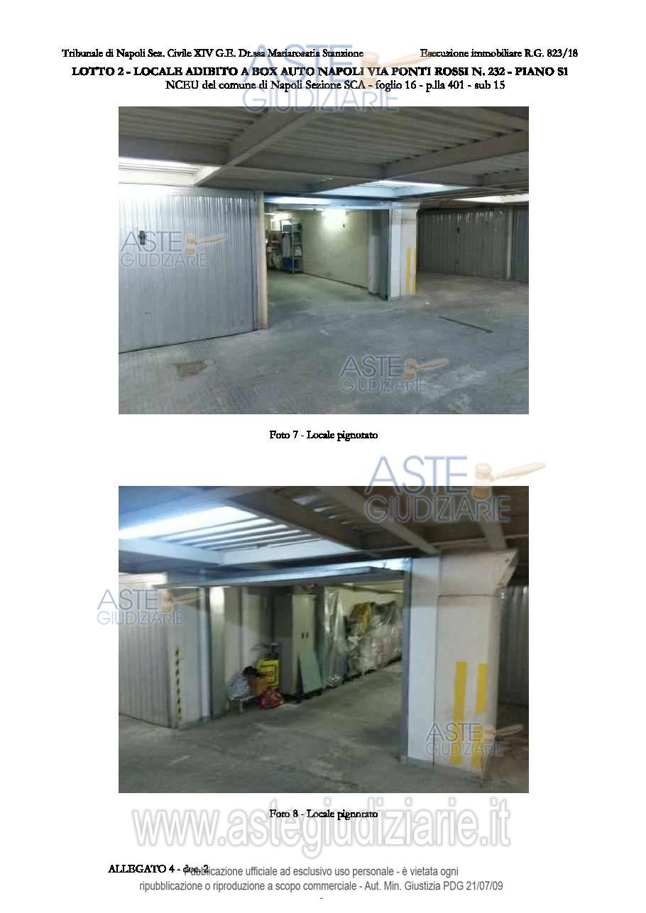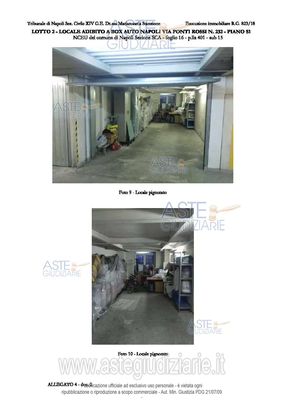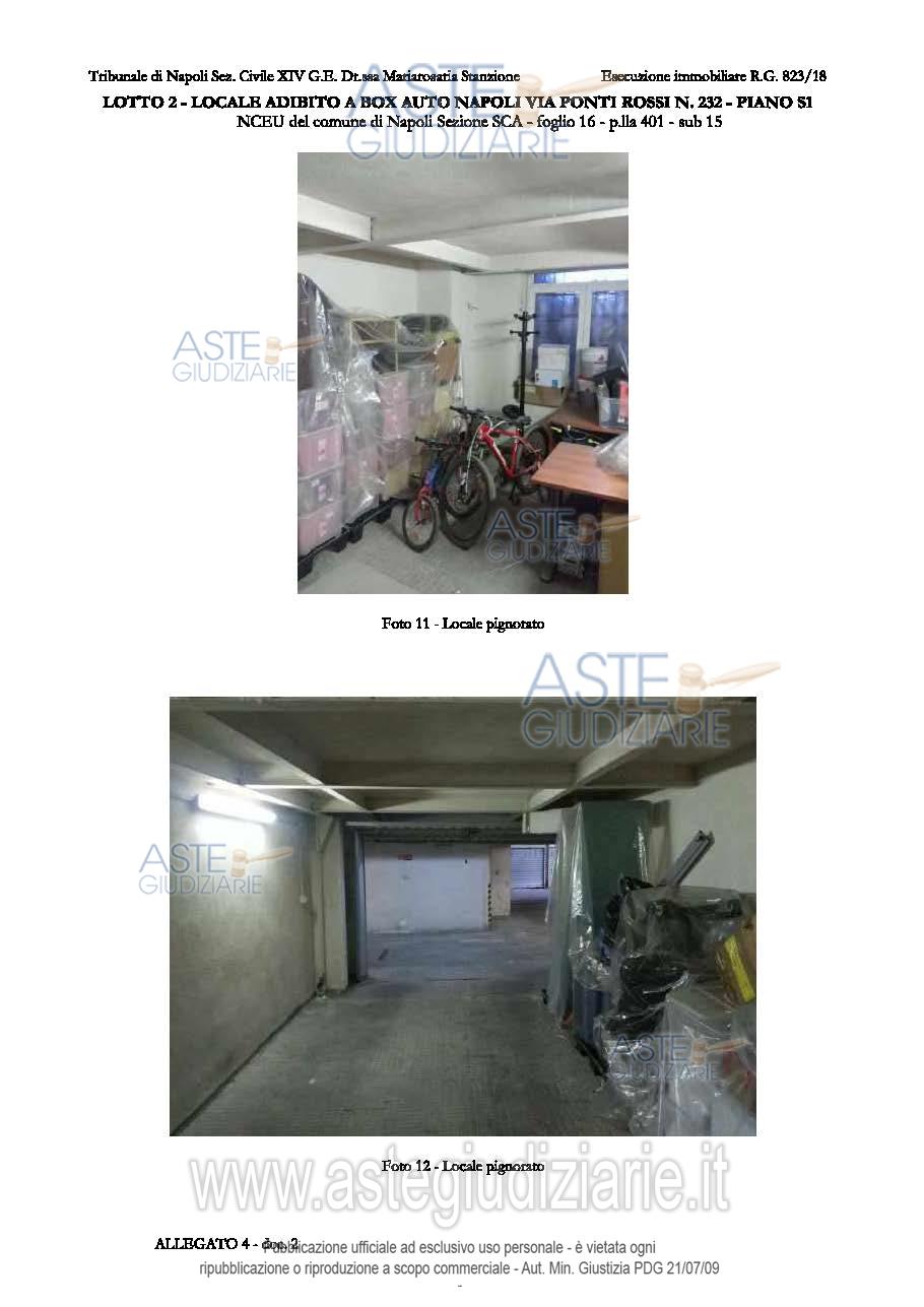 Vendita in attesa dell'emissione del nuovo bando d'asta. LOTTO 2: L2 - sub 15 - Piena proprietà del locale adibito a box auto, ubicato al primo piano seminterrato, sito in Napoli alla via Ponti Rossi n. 232, composta da un unico locale, di sup. netta calpestabile pari a 27.00 mq. Il bene è nella disponibilità della Custodia. Ultimo prezzo base € 25.500,00 (offerta minima € 19.125,00). Professionista delegato alla vendita Avv. Giorgio Parisi - Email "info.avv.giorgioparisi@gmail.com"; Tel. 0817877548. Custode Giudiziario Avv. Giorgio Parisi - Email "info.avv.giorgioparisi@gmail.com"; Tel. 0817877548. Rif. Tribunale di Napoli - Esecuzione immobiliare post legge 80 n. 823/2018