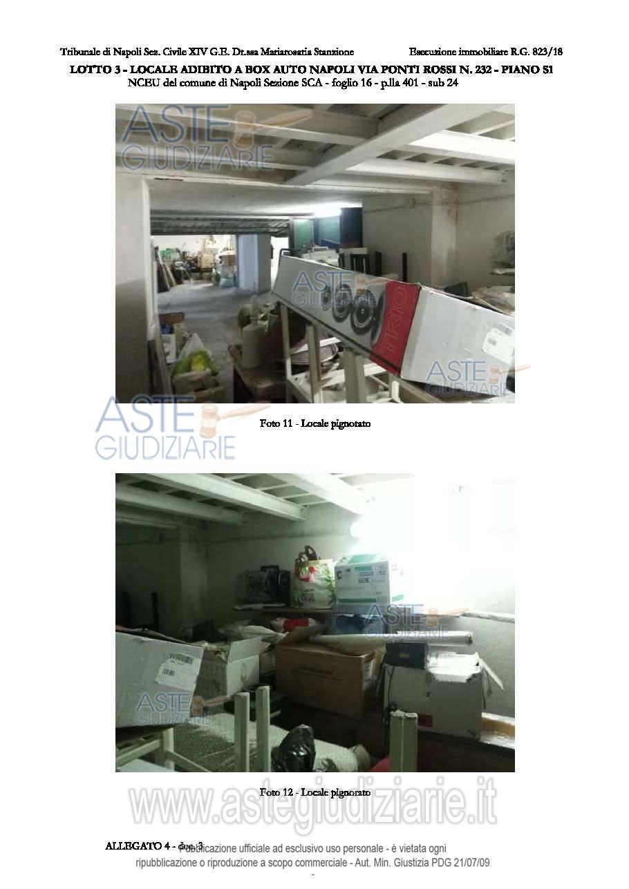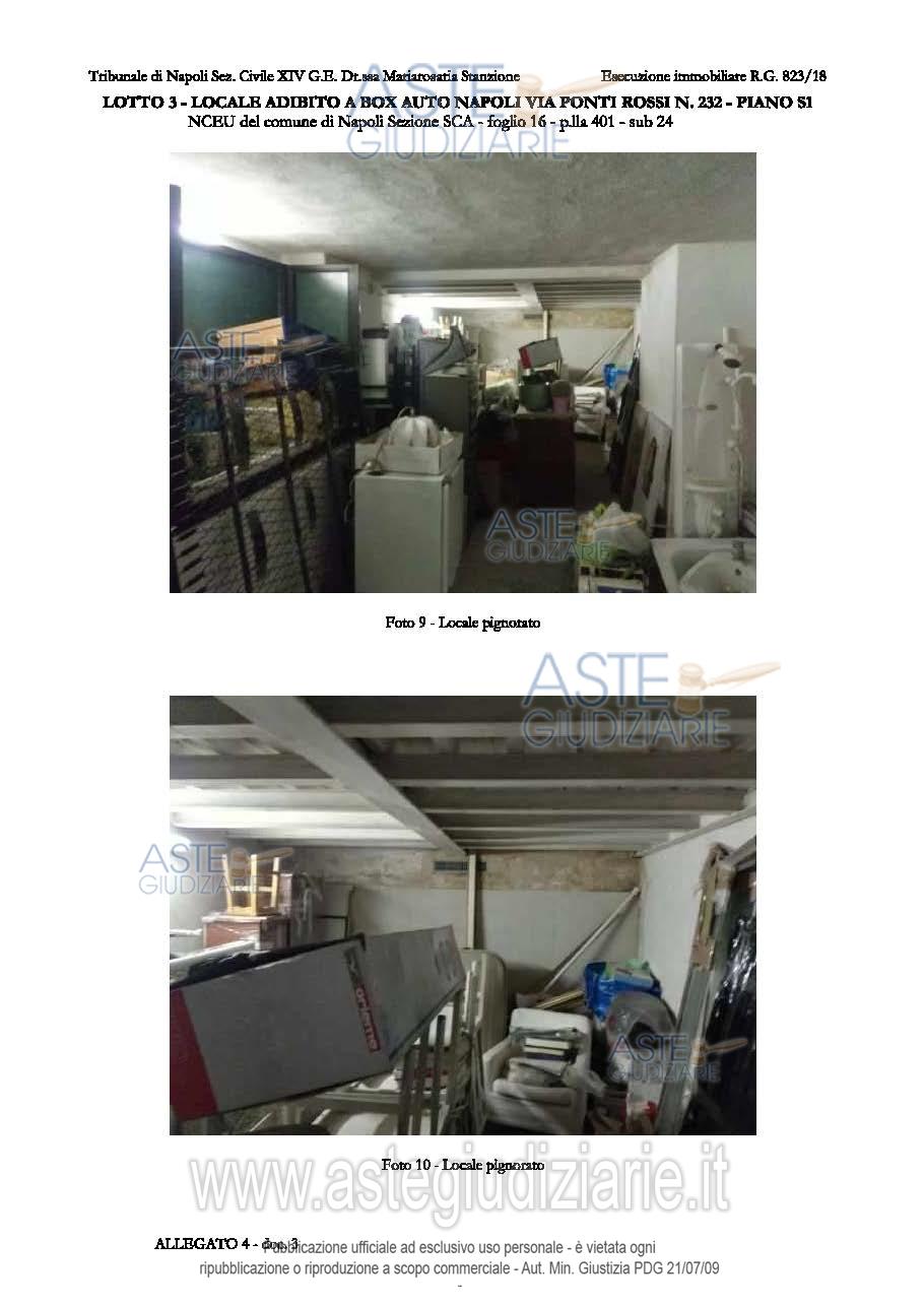 Vendita all'asta Senza incanto, con gara telematica asincrona - LOTTO 3: L3 - sub 24 - Piena proprietà del locale adibito a box auto, ubicato al primo piano seminterrato, sito in Napoli alla via Ponti Rossi n. 232, composta da un unico locale, di sup. netta calpestabile pari a 27.00 mq. Il bene è nella disponibilità del debitore. Prezzo base € 32.000,00 (offerta minima € 24.000,00). Data inizio operazioni di vendita: 21/10/2025 ore 10:15. Professionista delegato alla vendita Avv. Giorgio Parisi - Email "info.avv.giorgioparisi@gmail.com"; Tel. 0817877548. Custode Giudiziario Avv. Giorgio Parisi - Email "info.avv.giorgioparisi@gmail.com"; Tel. 0817877548. Rif. Tribunale di Napoli - Esecuzione immobiliare post legge 80 n. 823/2018