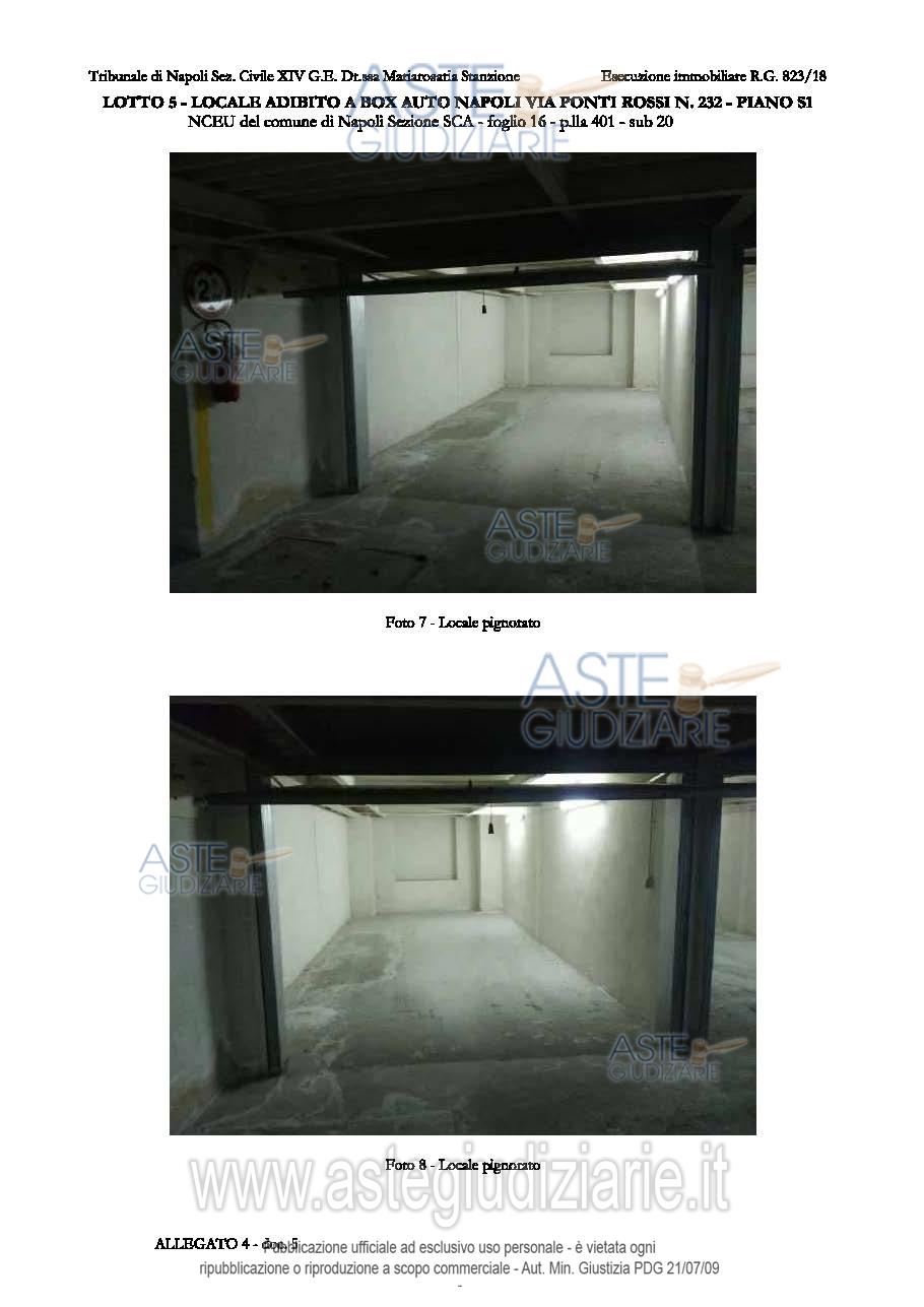 Vendita all'asta Senza incanto, con gara telematica asincrona - LOTTO 5: L5 - sub 20 - Piena proprietà del locale adibito a box auto, ubicato al primo piano seminterrato, sito in Napoli alla via Ponti Rossi n. 232, composta da un unico locale, di sup. netta calpestabile pari a 28.00 mq. Il bene è nella disponibilità della Custodia. Prezzo base € 25.500,00 (offerta minima € 19.125,00). Data inizio operazioni di vendita: 24/02/2026 ore 10:45. Professionista delegato alla vendita Avv. Giorgio Parisi - Email "info.avv.giorgioparisi@gmail.com"; Tel. 0817877548. Custode Giudiziario Avv. Giorgio Parisi - Email "info.avv.giorgioparisi@gmail.com"; Tel. 0817877548. Rif. Tribunale di Napoli - Esecuzione immobiliare post legge 80 n. 823/2018