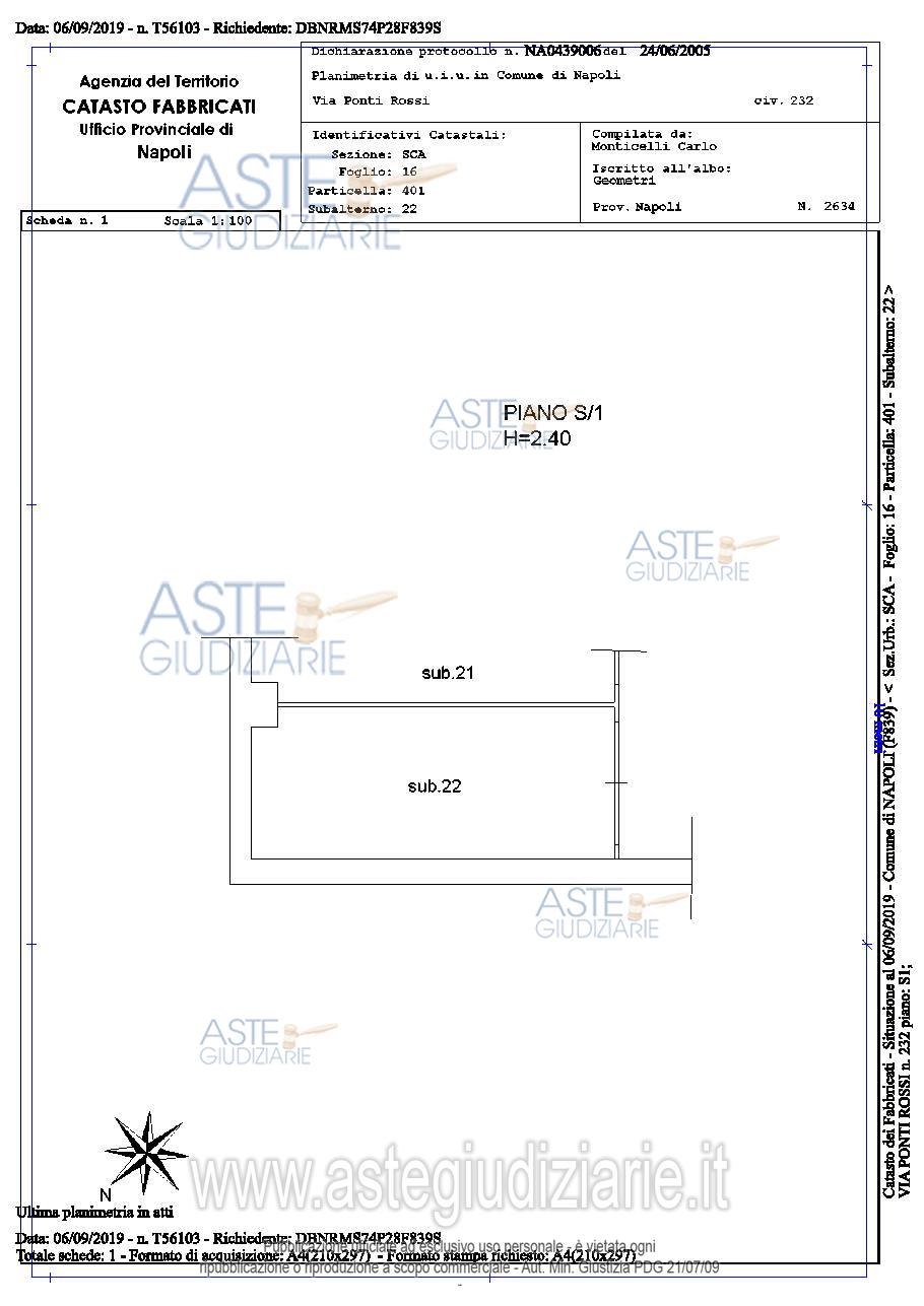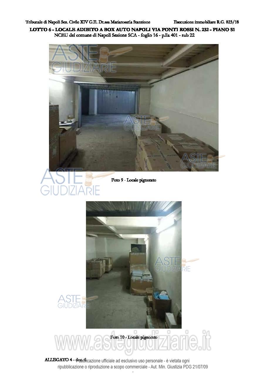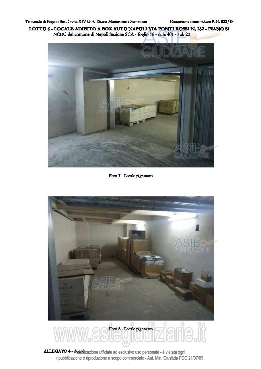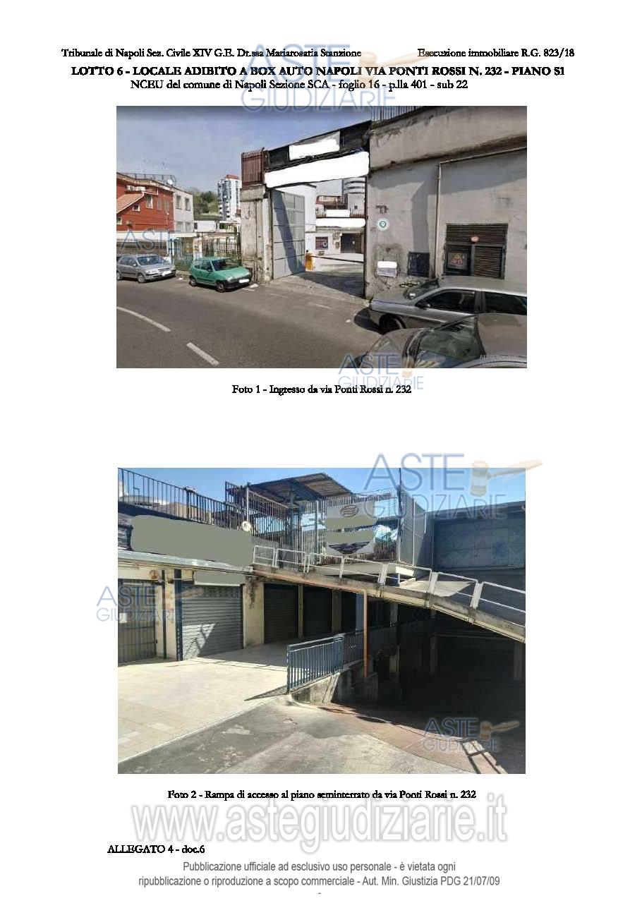 Vendita in attesa dell'emissione del nuovo bando d'asta. LOTTO 6: L6 - sub 22 - Piena proprietà del locale adibito a box auto, ubicato al primo piano seminterrato, sito in Napoli alla via Ponti Rossi n. 232, composta da un unico locale, di sup. netta calpestabile pari a 28.00 mq. Il bene è nella disponibilità della Custodia. Ultimo prezzo base € 27.000,00 (offerta minima € 20.250,00). Professionista delegato alla vendita Avv. Giorgio Parisi - Email "info.avv.giorgioparisi@gmail.com"; Tel. 0817877548. Custode Giudiziario Avv. Giorgio Parisi - Email "info.avv.giorgioparisi@gmail.com"; Tel. 0817877548. Rif. Tribunale di Napoli - Esecuzione immobiliare post legge 80 n. 823/2018