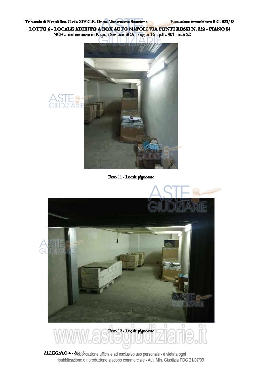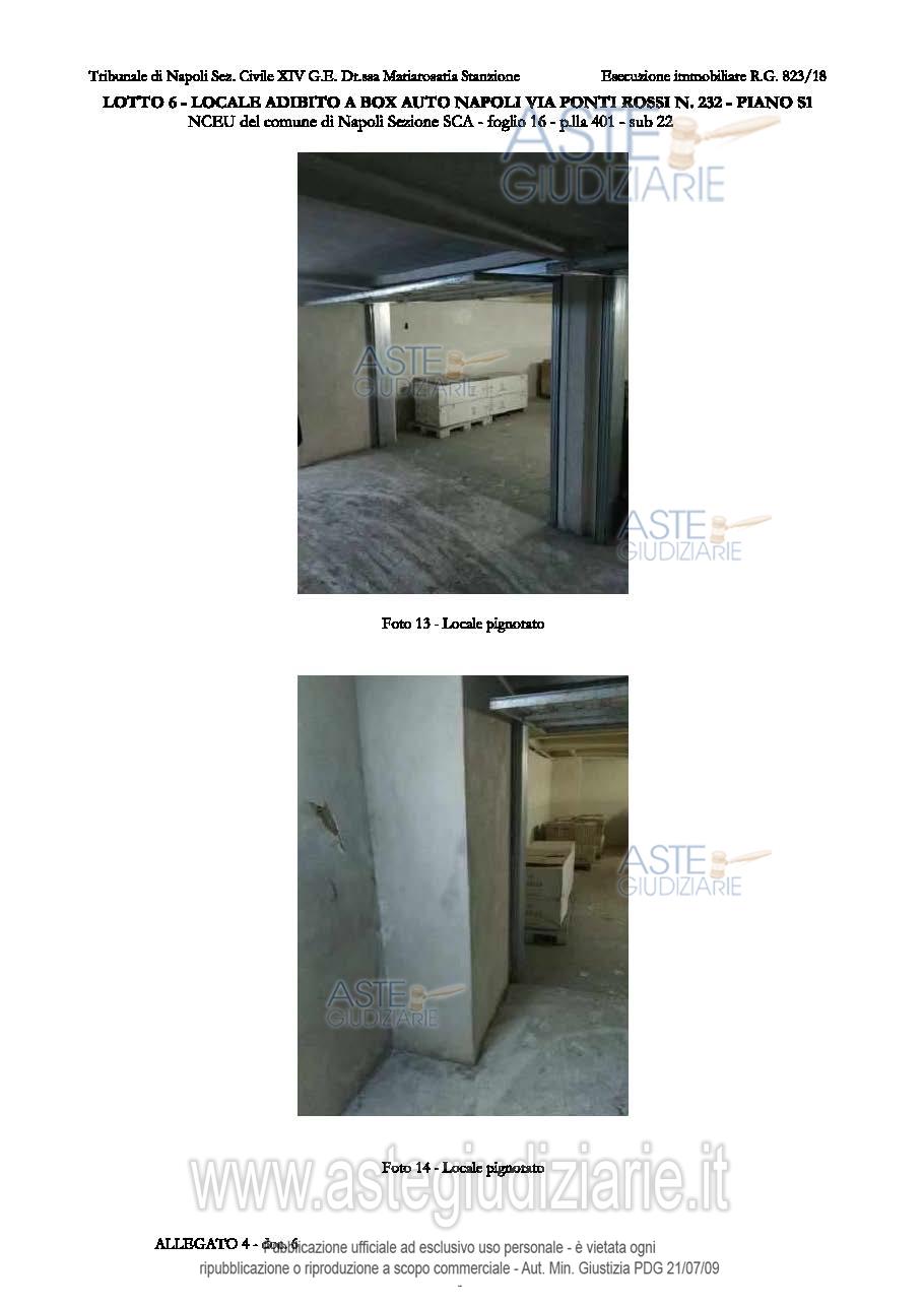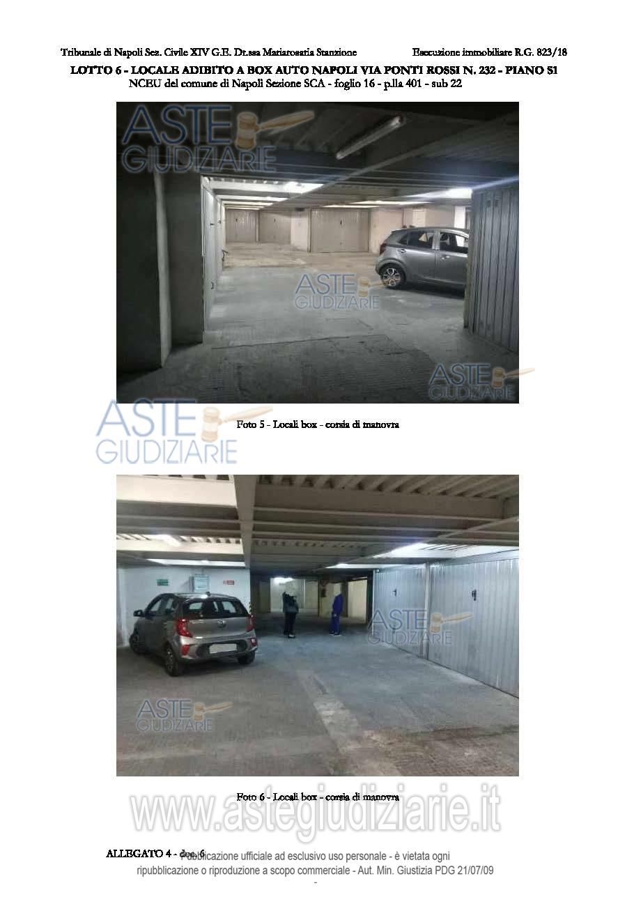 Vendita all'asta Senza incanto, con gara telematica asincrona - LOTTO 6: L6 - sub 22 - Piena proprietà del locale adibito a box auto, ubicato al primo piano seminterrato, sito in Napoli alla via Ponti Rossi n. 232, composta da un unico locale, di sup. netta calpestabile pari a 28.00 mq. Il bene è nella disponibilità del debitore. Prezzo base € 36.000,00 (offerta minima € 27.000,00). Data inizio operazioni di vendita: 21/10/2025 ore 11:00. Professionista delegato alla vendita Avv. Giorgio Parisi - Email "info.avv.giorgioparisi@gmail.com"; Tel. 0817877548. Custode Giudiziario Avv. Giorgio Parisi - Email "info.avv.giorgioparisi@gmail.com"; Tel. 0817877548. Rif. Tribunale di Napoli - Esecuzione immobiliare post legge 80 n. 823/2018