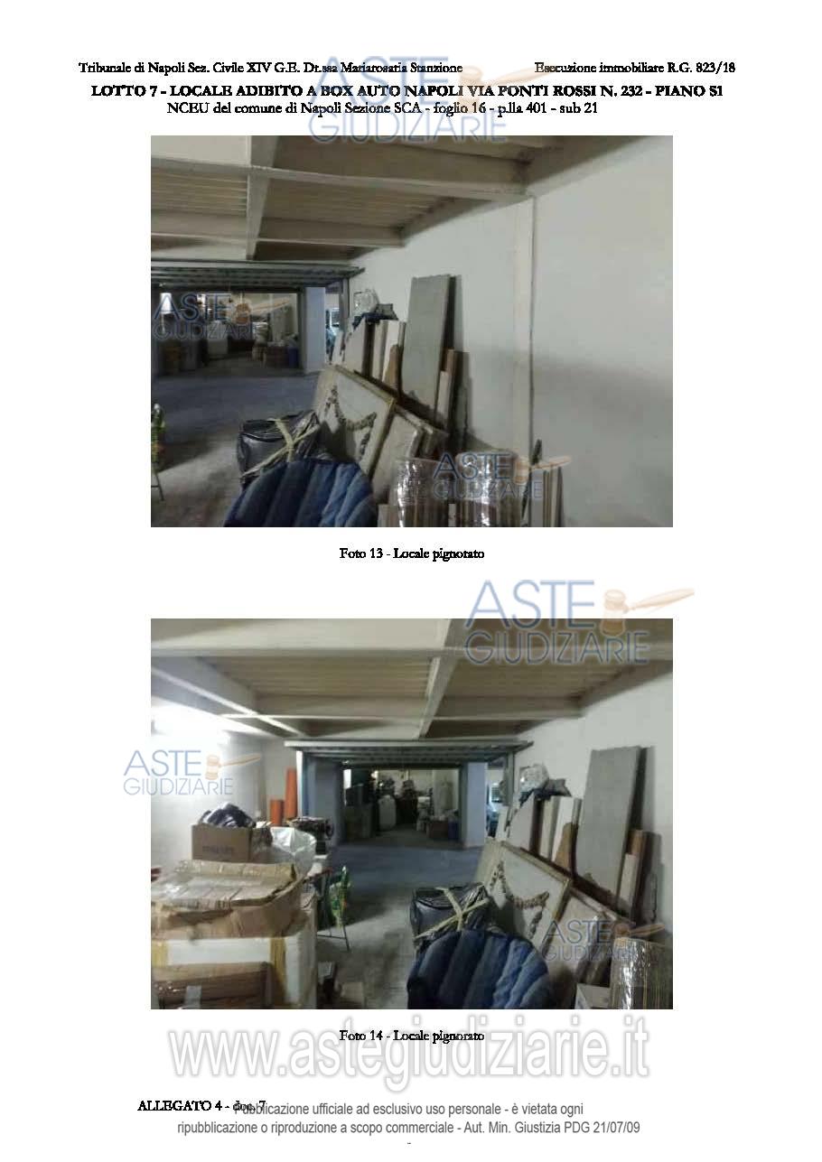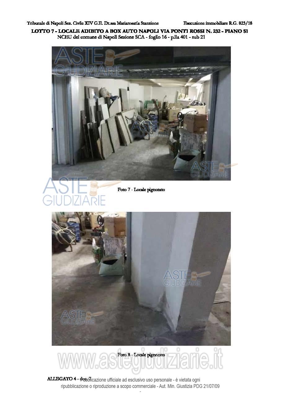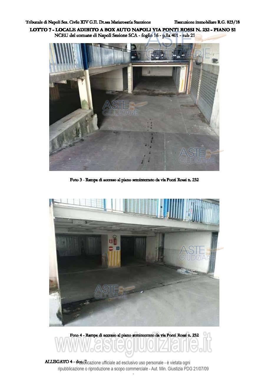 Vendita in attesa dell'emissione del nuovo bando d'asta. LOTTO 7: L7 - sub 21 - Piena proprietà del locale adibito a box auto, ubicato al primo piano seminterrato, sito in Napoli alla via Ponti Rossi n. 232, composta da un unico locale, di sup. netta calpestabile pari a 27.00 mq. Il bene è nella disponibilità della Custodia. Ultimo prezzo base € 24.800,00 (offerta minima € 18.600,00). Professionista delegato alla vendita Avv. Giorgio Parisi - Email "info.avv.giorgioparisi@gmail.com"; Tel. 0817877548. Custode Giudiziario Avv. Giorgio Parisi - Email "info.avv.giorgioparisi@gmail.com"; Tel. 0817877548. Rif. Tribunale di Napoli - Esecuzione immobiliare post legge 80 n. 823/2018