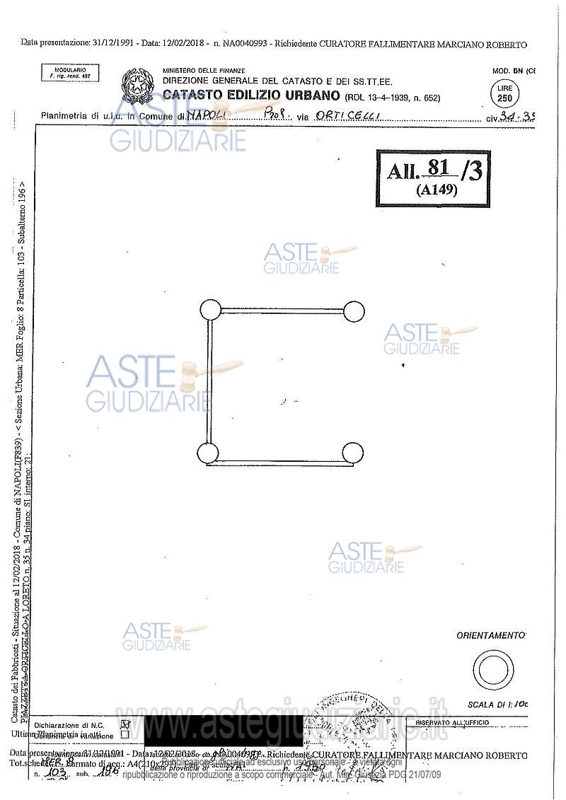 Vendita all'asta Senza incanto - LOTTO AV 81: Lotto AV lotto 81: La quarta parte indivisa del box meccanizzato per quattro posti auto al piano cantinato del fabbricato in Napoli, Via E. Cosenz 13.LE VISITE DEGLI IMMOBILI DA CONCORDARE CON IL CURATORE, SARANNO EFFETTUATE NELLE GIORNATE DEL: 10 SETTEMBRE 2025, 22 SETTEMBRE 2025, 6 OTTOBRE 2025, 20 OTTOBRE 2025, 10 NOVEMBRE 2025 CON PRENOTAZIONE DA EFFETTUARSI PRESSO LO STUDIO DEL CURATORE EFFETTIVAMENTE ENTRO IL: 4 SETTEMBRE 2025, 15 SETTEMBRE 2025, 29 SETTEMBRE 2025, 13 OTTOBRE 2025, 4 NOVEMBRE 2025. Prezzo base € 9.000,00 (offerta minima € 6.750,00). Data vendita 13/11/2025 ore 12:00. Giudice Dott. Francesco Paolo Feo. Curatore Dott. Roberto Marciano - Email "roberto.marciano@ass-com.it"; Tel. 0817641865. Rif. Tribunale di Napoli - Fallimentare n. 361/2002
