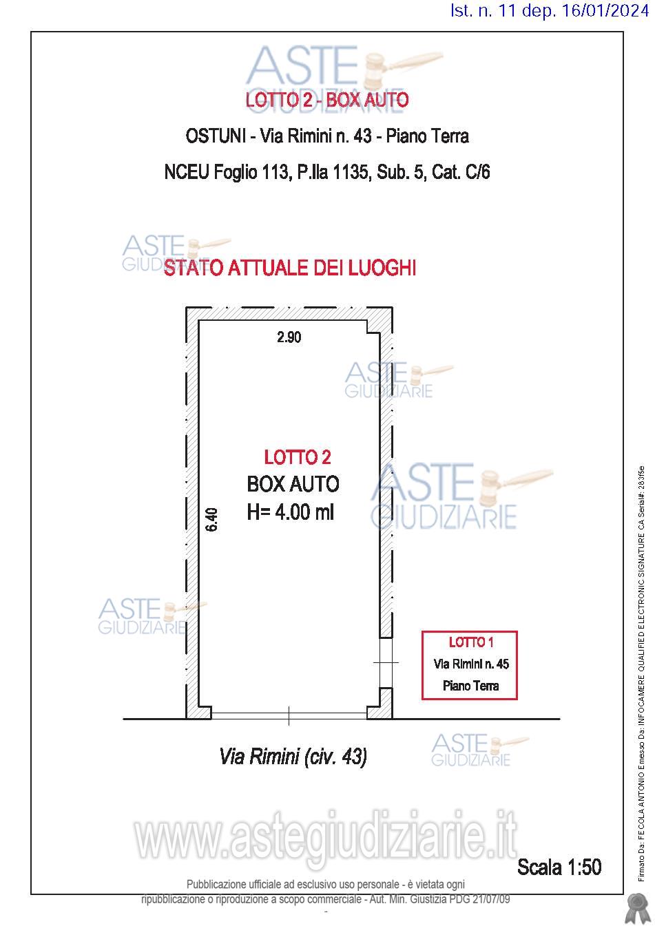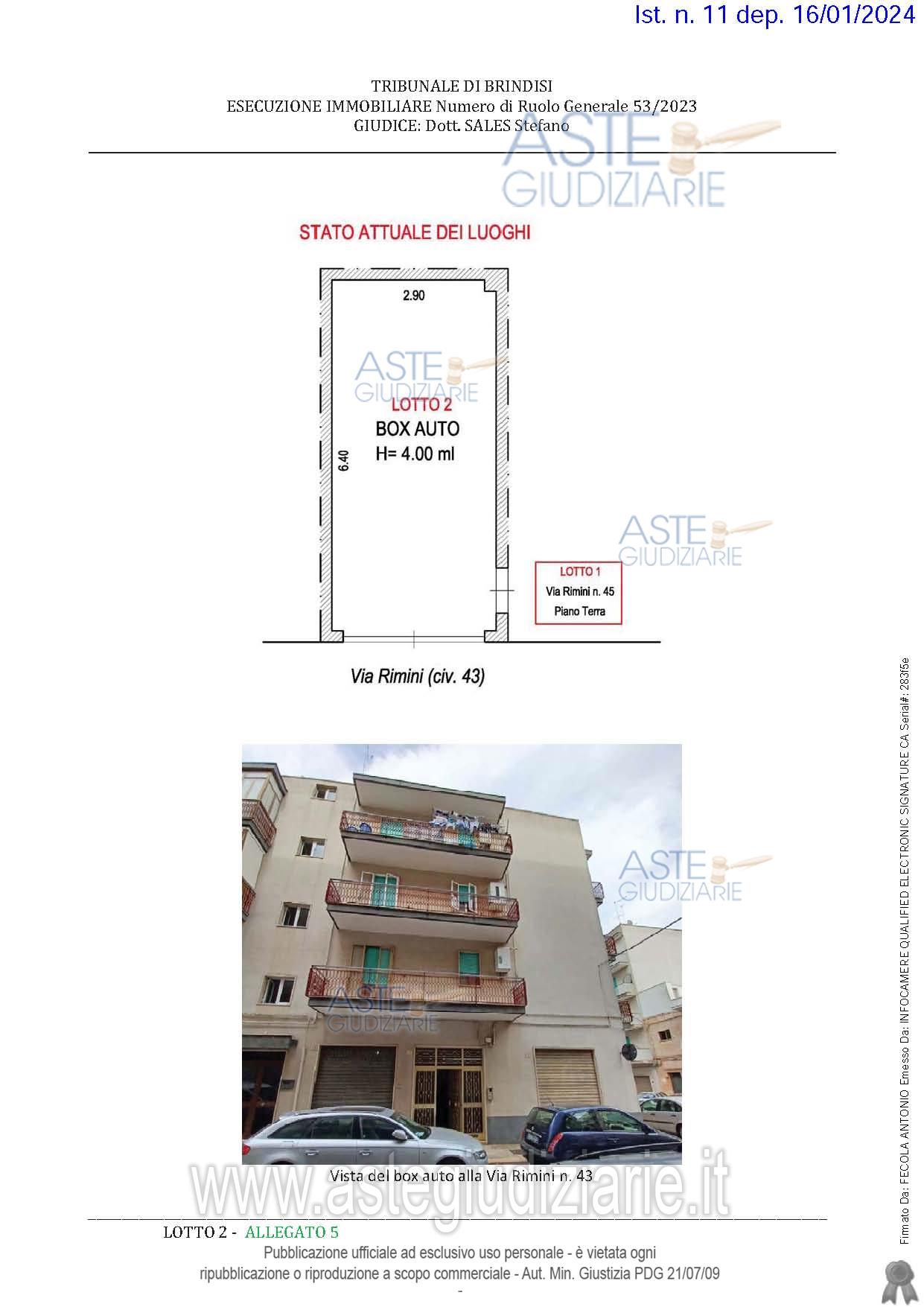 Vendita all'asta Senza incanto, con gara telematica asincrona - LOTTO 2: Box singolo della superficie commerciale di 20,00 mq per la quota di 1/1 di piena proprietà - Il box auto in esame è ubicato al piano terra, con accesso diretto dalla Via Rimini n. 43 attraverso un. Prezzo base € 17.750,00 (offerta minima € 13.312,50). Data inizio operazioni di vendita: 06/05/2026 ore 11:00. Giudice Francesco Giliberti. Professionista delegato alla vendita Avv. Luigi De Franco - Email "defrancoleg@gmail.com". Custode Giudiziario Avv. Luigi De Franco - Email "defrancoleg@gmail.com"; Tel. 0831364724. Rif. Tribunale di Brindisi - Esecuzione immobiliare post legge 80 n. 53/2023