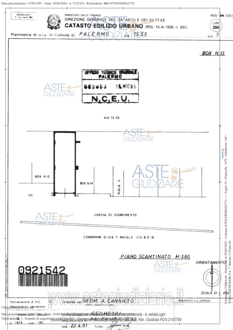 Vendita all'asta Senza incanto, con gara telematica sincrona mista - LOTTO 8: piena proprietà di un garage sito in Palermo, Via Luigi di Barca n. 7 (nell’atto di pignoramento è riportata la precedente Via TS 55 n. 7), interno 13, piano S1, censito al Catasto Fabbricati al foglio 16, particella 1475, sub 140, zona cens. 5, cat. C/6, classe 9, consistenza 37 mq, superficie catastale 37 mq, rendita catastale € 118,48, composto da un unico vano. Prezzo base € 22.500,00 (offerta minima € 16.875,00). Data vendita 04/06/2026 ore 16:00. Giudice Valentina Imperiale. Professionista delegato alla vendita Avv. Michele Sciarrino - Email "michelesciarrino@libero.it"; Tel. 0917282149. Custode Giudiziario Avv. Michele Sciarrino - Email "michelesciarrino@libero.it"; Tel. 0917282149. Rif. Tribunale di Palermo - Esecuzione immobiliare post legge 80 n. 87/2023