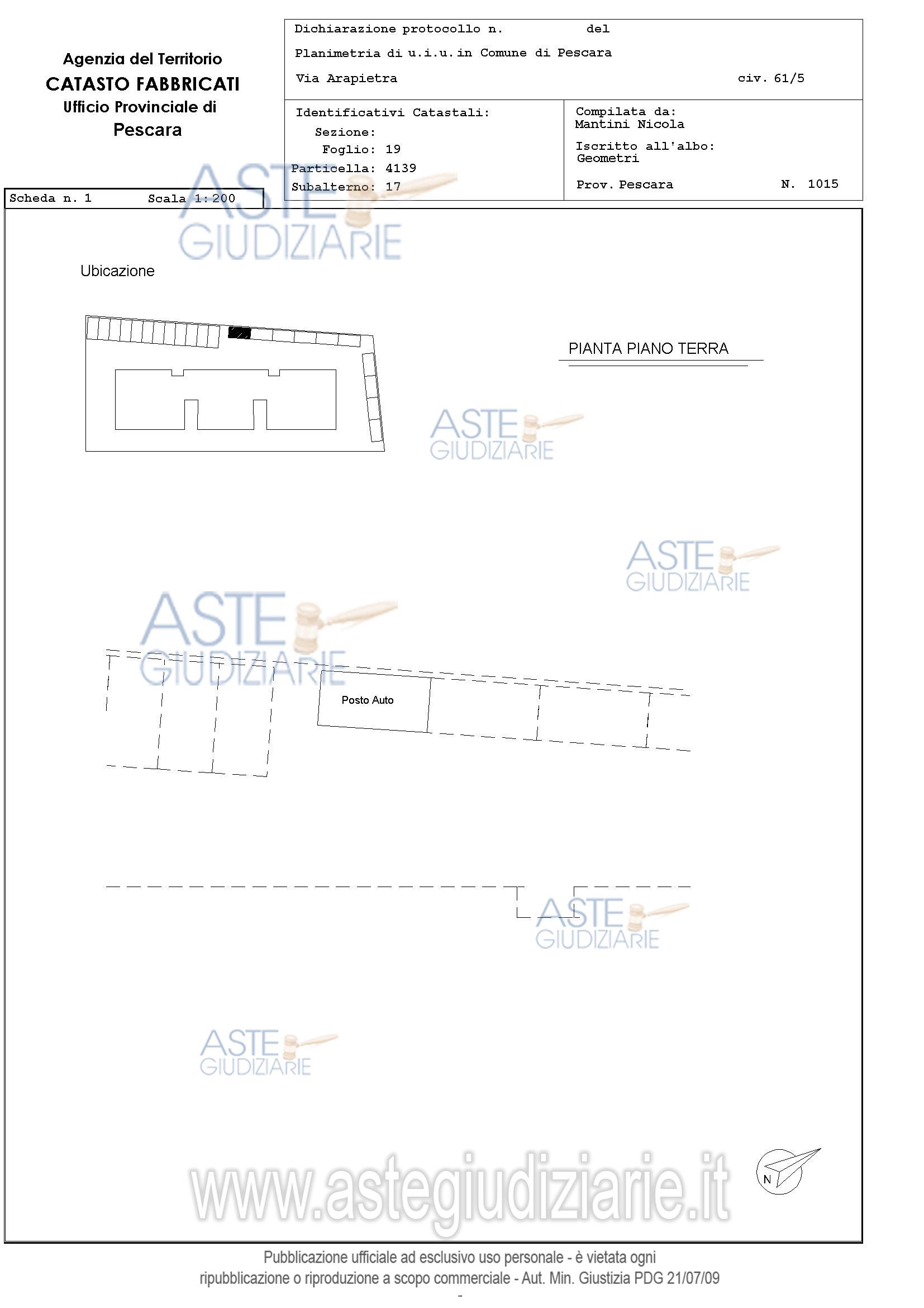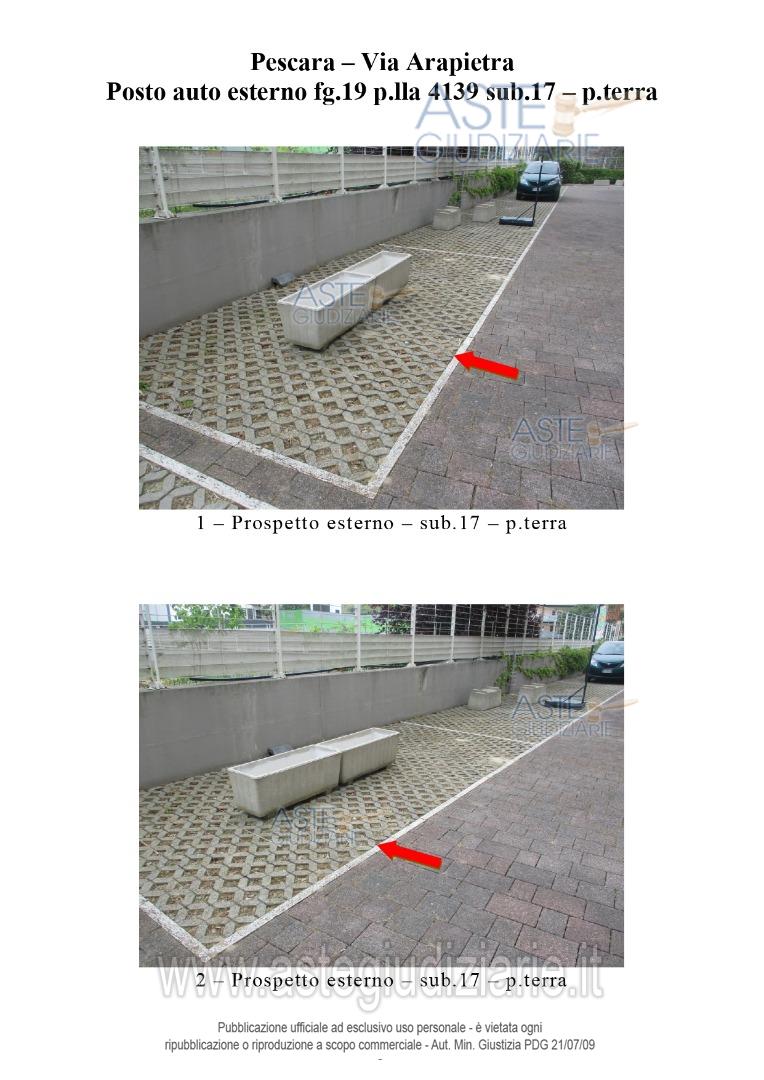 Vendita all'asta Senza incanto, con gara telematica asincrona - LOTTO 2: Posto auto esterno scoperto ubicato a Pescara - Via Arapietra n.61/5 - piano Terra (sub.17) Identificato al catasto Fabbricati - Fg. 19, Part. 4139, Sub. 17, Zc. 1, Categoria C6. L’immobile viene posto in vendita per il diritto di Proprietà (1/1). Prezzo base € 5.400,00 (offerta minima € 4.050,00). Data inizio operazioni di vendita: 16/12/2025 ore 09:45. Giudice Dott. Daniela Angelozzi. Professionista delegato alla vendita Dott. Alberto Agresta - Email "alberto_agresta@yahoo.it". Custode Giudiziario Dott. Alberto Agresta - Email "alberto_agresta@yahoo.it"; Tel. 0852059456. Rif. Tribunale di Pescara - Espropriazione immobiliare (cartabia) n. 139/2023