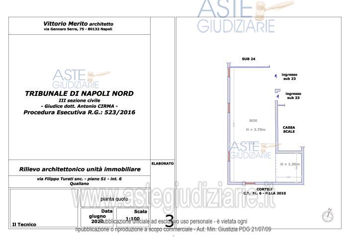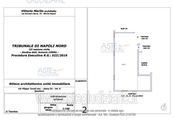 Vendita all'asta Senza incanto, con gara telematica asincrona - LOTTO 7: Piena ed esclusiva proprietà di box ubicato in Qualiano (NA) alla via Filippo Turati n. 6 (catastalmente via Filippo Turati snc), piano S1, int. 6; composto da un unico locale box, riportato al Catasto Fabbricati del Comune di Qualiano al F. 6, p.lla 2013, sub. 23, cat. C/6, cl. 3, consistenza 94 mq., sup. cat. 104 mq., rendita € 237,88. Prezzo base € 38.475,00 (offerta minima € 28.856,25). Data inizio operazioni di vendita: 10/03/2026 ore 15:00. Professionista delegato alla vendita Avv. Marco D'arcangelo - Email "marcodarca1974@gmail.com"; Tel. 0810491814. Custode Giudiziario Avv. Marco D'arcangelo - Email "marcodarca1974@gmail.com"; Tel. 0810491814. Rif. Tribunale di Napoli Nord - Esecuzione immobiliare post legge 80 n. 523/2016