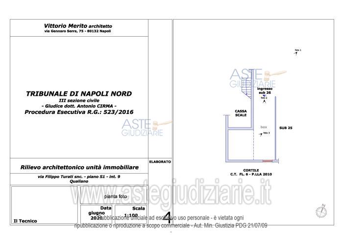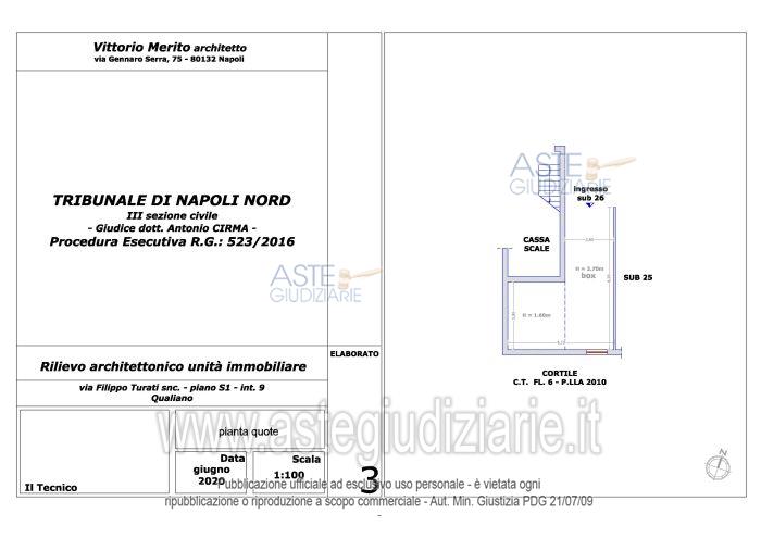 Vendita all'asta Senza incanto, con gara telematica asincrona - LOTTO 8: Piena ed esclusiva proprietà di box ubicato in Qualiano (NA) alla via Filippo Turati n. 6 (catastalmente via Filippo Turati snc), piano S1, int. 9; composto da un unico locale box, identificato al Catasto Fabbricati del Comune di Qualiano al F. 6, p.lla 2013, sub. 26, cat. C/6, cl. 3, consistenza 35 mq, sup. cat. 25 mq, rendita € 88,57. Prezzo base € 14.793,75 (offerta minima € 11.095,31). Data inizio operazioni di vendita: 10/03/2026 ore 15:00. Professionista delegato alla vendita Avv. Marco D'arcangelo - Email "marcodarca1974@gmail.com"; Tel. 0810491814. Custode Giudiziario Avv. Marco D'arcangelo - Email "marcodarca1974@gmail.com"; Tel. 0810491814. Rif. Tribunale di Napoli Nord - Esecuzione immobiliare post legge 80 n. 523/2016