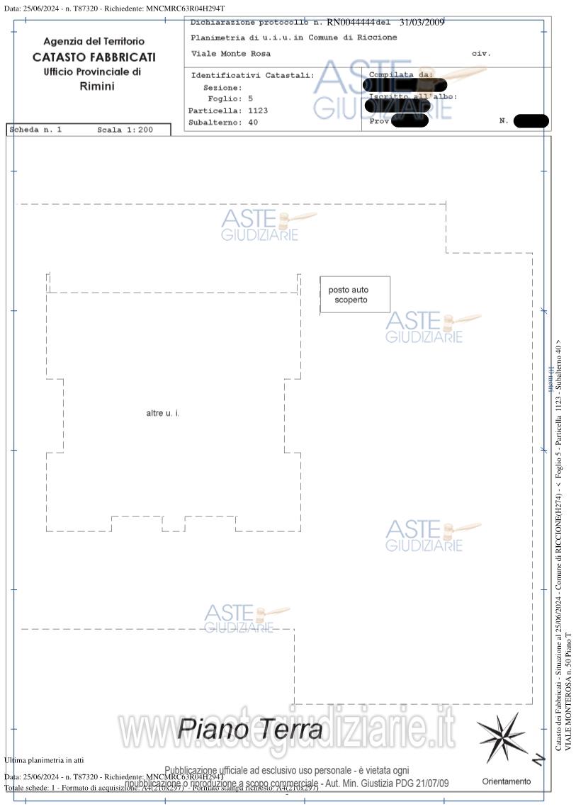 Vendita all'asta Senza incanto, con gara telematica asincrona - LOTTO 17: Piena proprietà per la quota di 1/1 su porzione di fabbricato urbano in regime condominiale, denominato “Residenza I Pini“, ad uso civile abitazione, ufficio, autorimesse e posti auto scoperti, disposto su sei piani (interrato-terra-primo-secondo-terzo-quarto) sito in Comune di RICCIONE (RN), Viale Monte Rosa civico n. 50, e precisamente: ? POSTO AUTO SCOPERTO al piano terra. Sviluppa una superficie lorda complessiva di circa mq 12 (dodici), confinante con i subalterni 39, 41 e 52, salvo altri. Prezzo base € 6.750,00 (offerta minima € 5.062,50). Data inizio operazioni di vendita: 12/05/2026 ore 09:00. Giudice Letizia Bocchini. Professionista delegato alla vendita Not. Giorgia Dondi - Email "gdondi.2@notariato.it"; Tel. 054129305. Custode Giudiziario Not. Giorgia Dondi - Email "gdondi.2@notariato.it"; Tel. 054129305. Rif. Tribunale di Rimini - Espropriazione immobiliare (cartabia) n. 39/2024