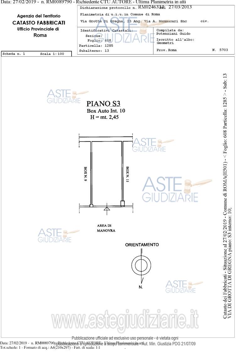 Vendita in attesa dell'emissione del nuovo bando d'asta. LOTTO 10: Proprietà piena ed esclusiva di box auto sito in comune di Roma (RM), quartiere "Collatino", municipio IV, via di Grotta di Gregna 23, piano S3, interno 10, posto all'interno di un edificio interrato con destinazione d'uso autorimessa, avente una superficie lorda di 15,90 mq. e un’altezza di circa 2,45 m. Ultimo prezzo base € 1.907,71 (offerta minima € 1.430,78). Giudice Dott. Bianca Ferramosca. Professionista delegato alla vendita Avv. Luca Bernardini. Custode Giudiziario Ivg Di Roma Srl - Email "pvp@visiteivgroma.it"; Tel. 0689569801. Rif. Tribunale di Roma - Esecuzione immobiliare post legge 80 n. 239/2018