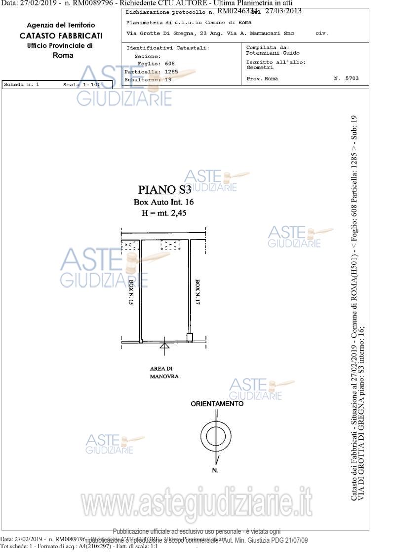 Vendita in attesa dell'emissione del nuovo bando d'asta. LOTTO 16: Proprietà piena ed esclusiva di box auto sito in comune di Roma (RM), quartiere "Collatino", municipio IV, via di Grotta di Gregna 23, piano S3, interno 16, posto all'interno di un edificio interrato con destinazione d'uso autorimessa, avente una superficie lorda di 15 mq. e un’altezza di circa 2,45 m. Ultimo prezzo base € 1.907,71 (offerta minima € 1.430,78). Giudice Dott. Bianca Ferramosca. Professionista delegato alla vendita Avv. Luca Bernardini. Custode Giudiziario Ivg Di Roma Srl - Email "pvp@visiteivgroma.it"; Tel. 0689569801. Rif. Tribunale di Roma - Esecuzione immobiliare post legge 80 n. 239/2018