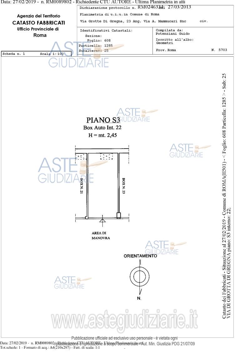 Vendita in attesa dell'emissione del nuovo bando d'asta. LOTTO 22: Proprietà piena ed esclusiva di box auto sito in comune di Roma (RM), quartiere "Collatino", municipio IV, via di Grotta di Gregna 23, piano S3, interno 22, posto all'interno di un edificio interrato con destinazione d'uso autorimessa, avente una superficie lorda di 15 mq. e un’altezza di circa 2,45 m. Ultimo prezzo base € 1.907,71 (offerta minima € 1.430,78). Giudice Dott. Bianca Ferramosca. Professionista delegato alla vendita Avv. Luca Bernardini. Custode Giudiziario Ivg Di Roma Srl - Email "pvp@visiteivgroma.it"; Tel. 0689569801. Rif. Tribunale di Roma - Esecuzione immobiliare post legge 80 n. 239/2018