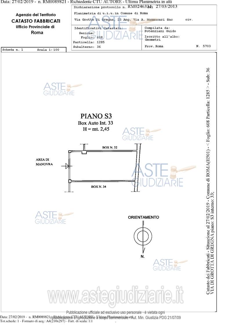 Vendita in attesa dell'emissione del nuovo bando d'asta. LOTTO 33: Proprietà piena ed esclusiva di box auto sito in comune di Roma (RM), quartiere "Collatino", municipio IV, via di Grotta di Gregna 23, piano S3, interno 33, posto all'interno di un edificio interrato con destinazione d'uso autorimessa, avente una superficie lorda di 15,75 mq. e un’altezza di circa 2,45 m. Ultimo prezzo base € 1.893,89 (offerta minima € 1.420,42). Giudice Dott. Bianca Ferramosca. Professionista delegato alla vendita Avv. Luca Bernardini. Custode Giudiziario Ivg Di Roma Srl - Email "pvp@visiteivgroma.it"; Tel. 0689569801. Rif. Tribunale di Roma - Esecuzione immobiliare post legge 80 n. 239/2018