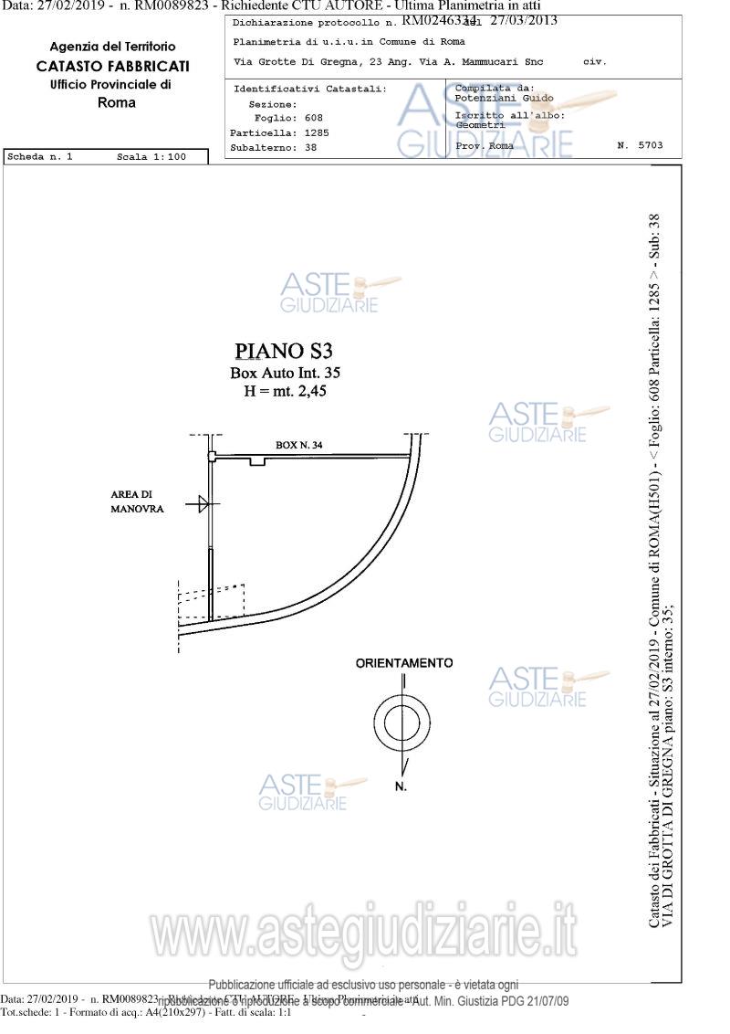 Vendita in attesa dell'emissione del nuovo bando d'asta. LOTTO 35: Proprietà piena ed esclusiva di box auto sito in comune di Roma (RM), quartiere "Collatino", municipio IV, via di Grotta di Gregna 23, piano S3, interno 35, posto all'interno di un edificio interrato con destinazione d'uso autorimessa, avente una superficie lorda di 19,90 mq. e un’altezza di circa 2,45 m. Ultimo prezzo base € 2.391,55 (offerta minima € 1.793,66). Giudice Dott. Bianca Ferramosca. Professionista delegato alla vendita Avv. Luca Bernardini. Custode Giudiziario Ivg Di Roma Srl - Email "pvp@visiteivgroma.it"; Tel. 0689569801. Rif. Tribunale di Roma - Esecuzione immobiliare post legge 80 n. 239/2018