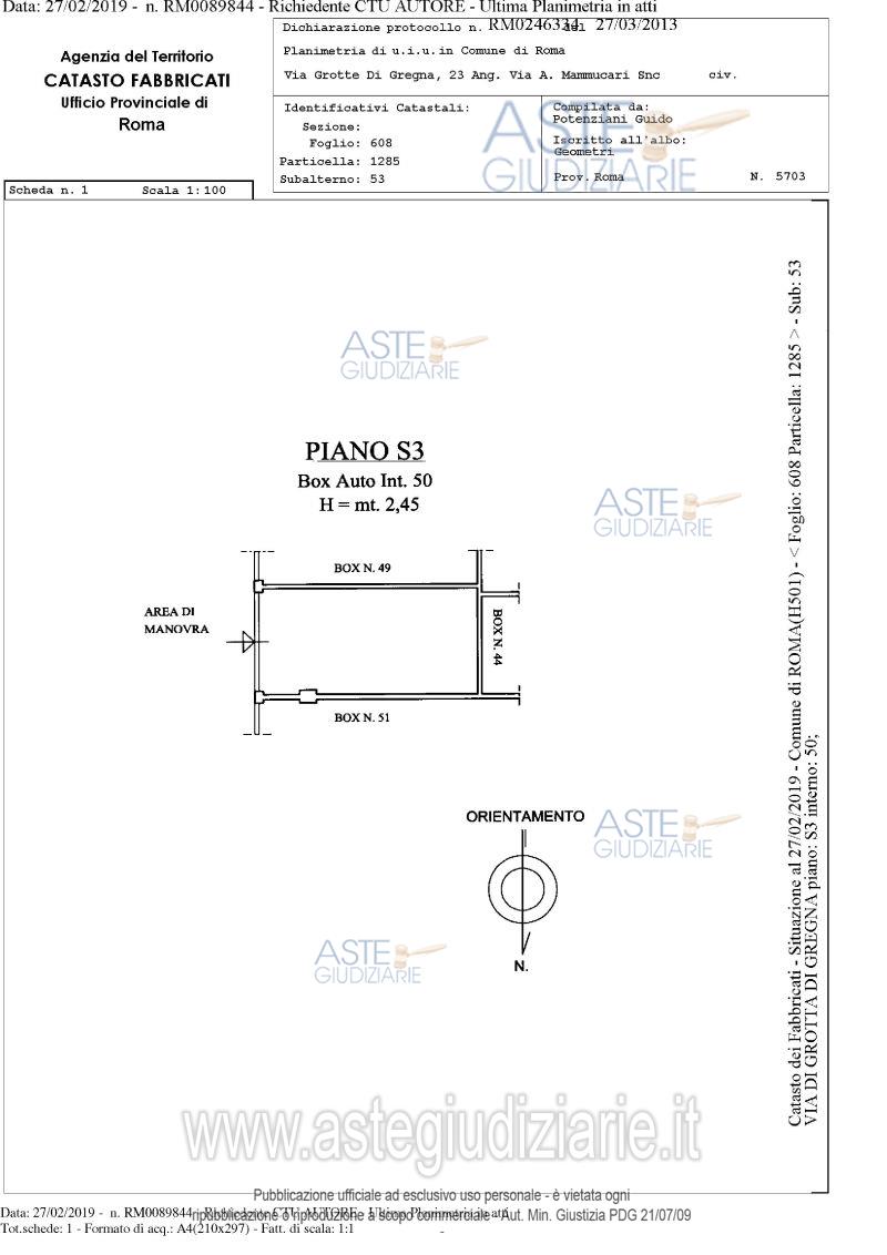 Vendita in attesa dell'emissione del nuovo bando d'asta. LOTTO 50: Proprietà piena ed esclusiva di box auto sito in comune di Roma (RM), quartiere "Collatino", municipio IV, via di Grotta di Gregna 23, piano S3, interno 50, posto all'interno di un edificio interrato con destinazione d'uso autorimessa, avente una superficie lorda di 13,50 mq. e un’altezza di circa 2,45 m. Ultimo prezzo base € 1.299,46 (offerta minima € 974,59). Giudice Dott. Bianca Ferramosca. Professionista delegato alla vendita Avv. Luca Bernardini. Custode Giudiziario Ivg Di Roma Srl - Email "pvp@visiteivgroma.it"; Tel. 0689569801. Rif. Tribunale di Roma - Esecuzione immobiliare post legge 80 n. 239/2018