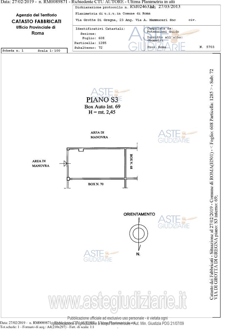 Vendita in attesa dell'emissione del nuovo bando d'asta. LOTTO 69: Proprietà piena ed esclusiva di box auto sito in comune di Roma (RM), quartiere "Collatino", municipio IV, via di Grotta di Gregna 23, piano S3, interno 69, posto all'interno di un edificio interrato con destinazione d'uso autorimessa, avente una superficie lorda di 14 mq. e un’altezza di circa 2,45 m. Ultimo prezzo base € 1.783,30 (offerta minima € 1.337,47). Giudice Dott. Bianca Ferramosca. Professionista delegato alla vendita Avv. Luca Bernardini. Custode Giudiziario Ivg Di Roma Srl - Email "pvp@visiteivgroma.it"; Tel. 0689569801. Rif. Tribunale di Roma - Esecuzione immobiliare post legge 80 n. 239/2018