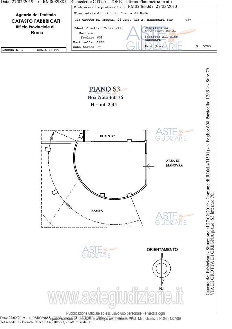 Vendita in attesa dell'emissione del nuovo bando d'asta. LOTTO 76: Proprietà piena ed esclusiva di box auto sito in comune di Roma (RM), quartiere "Collatino", municipio IV, via di Grotta di Gregna 23, piano S3, interno 76, posto all'interno di un edificio interrato con destinazione d'uso autorimessa, avente una superficie lorda di 30,00 mq. e un’altezza di circa 2,45 m. Ultimo prezzo base € 3.131,14 (offerta minima € 2.348,35). Giudice Dott. Bianca Ferramosca. Professionista delegato alla vendita Avv. Luca Bernardini. Custode Giudiziario Ivg Di Roma Srl - Email "pvp@visiteivgroma.it"; Tel. 0689569801. Rif. Tribunale di Roma - Esecuzione immobiliare post legge 80 n. 239/2018