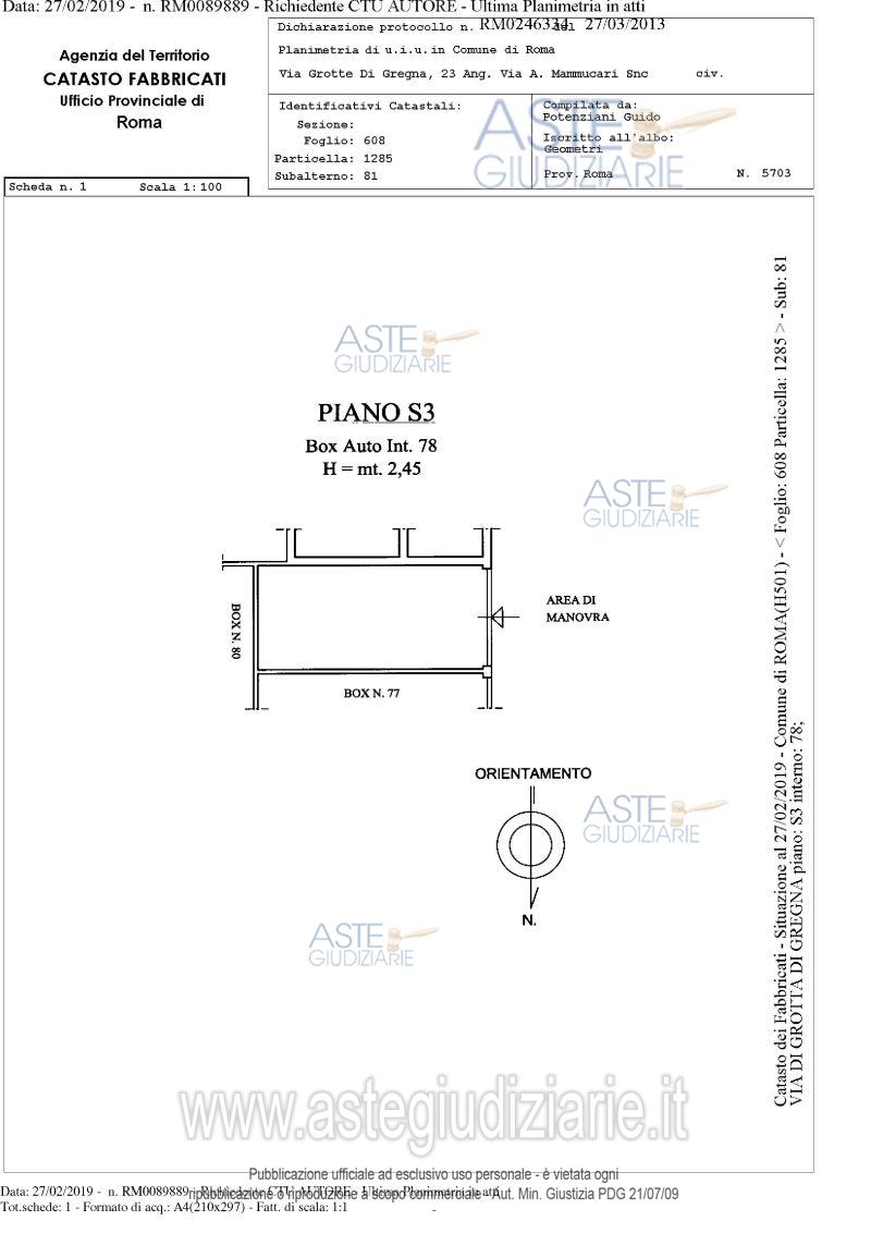 Vendita in attesa dell'emissione del nuovo bando d'asta. LOTTO 78: Proprietà piena ed esclusiva di box auto sito in comune di Roma (RM), quartiere "Collatino", municipio IV, via di Grotta di Gregna 23, piano S3, interno 78, posto all'interno di un edificio interrato con destinazione d'uso autorimessa, avente una superficie lorda di 15 mq. e un’altezza di circa 2,45 m. Ultimo prezzo base € 1.658,88 (offerta minima € 1.244,16). Giudice Dott. Bianca Ferramosca. Professionista delegato alla vendita Avv. Luca Bernardini. Custode Giudiziario Ivg Di Roma Srl - Email "pvp@visiteivgroma.it"; Tel. 0689569801. Rif. Tribunale di Roma - Esecuzione immobiliare post legge 80 n. 239/2018