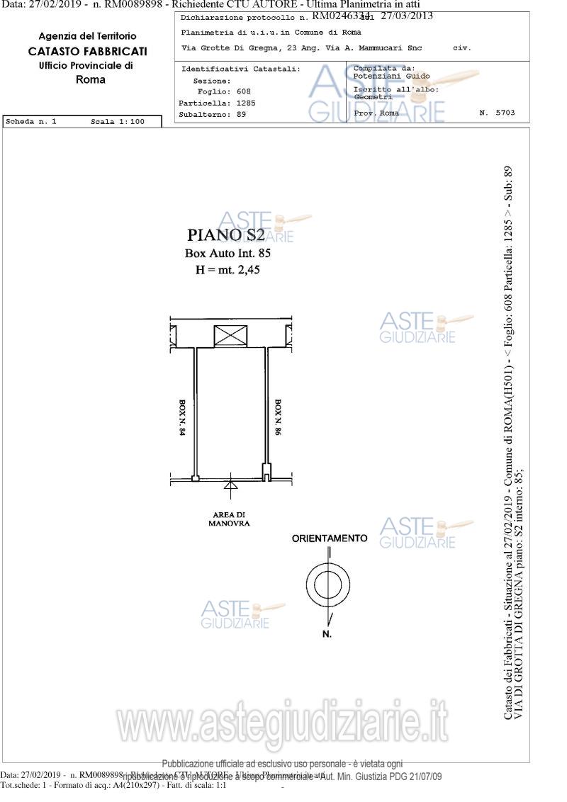 Vendita in attesa dell'emissione del nuovo bando d'asta. LOTTO 84: Proprietà piena ed esclusiva di box auto sito in comune di Roma (RM), quartiere "Collatino", municipio IV, via di Grotta di Gregna 23, piano S2, interno 85, posto all'interno di un edificio interrato con destinazione d'uso autorimessa, avente una superficie lorda di 13,05 mq. e un’altezza di circa 2,45 m. Ultimo prezzo base € 1.624,32 (offerta minima € 1.218,24). Giudice Dott. Bianca Ferramosca. Professionista delegato alla vendita Avv. Luca Bernardini. Custode Giudiziario Ivg Di Roma Srl - Email "pvp@visiteivgroma.it"; Tel. 0689569801. Rif. Tribunale di Roma - Esecuzione immobiliare post legge 80 n. 239/2018