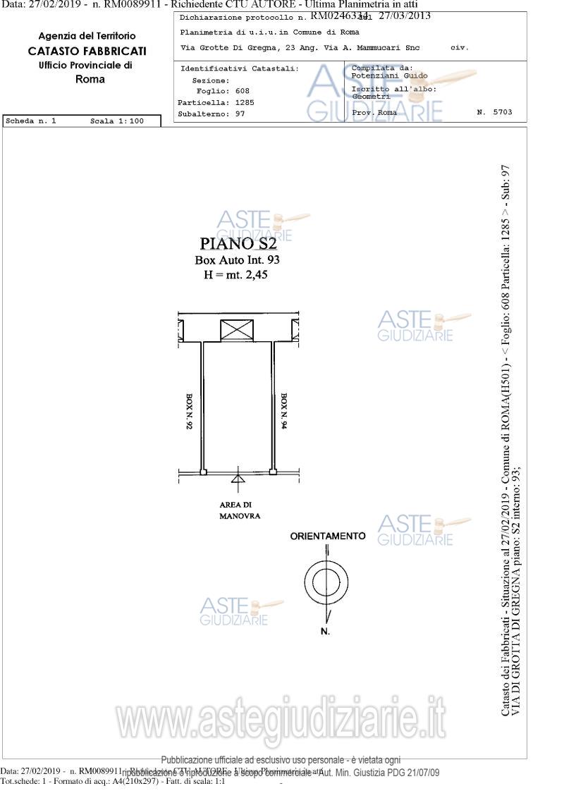 Vendita in attesa dell'emissione del nuovo bando d'asta. LOTTO 92: Proprietà piena ed esclusiva di box auto sito in comune di Roma (RM), quartiere "Collatino", municipio IV, via di Grotta di Gregna 23, piano S2, interno 93, posto all'interno di un edificio interrato con destinazione d'uso autorimessa, avente una superficie lorda di 13,10 mq. e un’altezza di circa 2,45 m. Ultimo prezzo base € 1.728,00 (offerta minima € 1.296,00). Giudice Dott. Bianca Ferramosca. Professionista delegato alla vendita Avv. Luca Bernardini. Custode Giudiziario Ivg Di Roma Srl - Email "pvp@visiteivgroma.it"; Tel. 0689569801. Rif. Tribunale di Roma - Esecuzione immobiliare post legge 80 n. 239/2018
